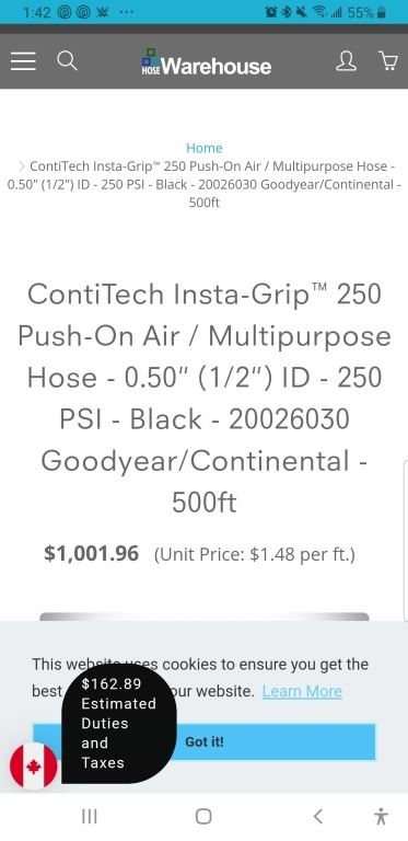 ContiTech Insta-Grip 250 Push-On Air / Multipurpose Hose - 0.50" (1/2") 250 PSI - Black RETAIL $1000+