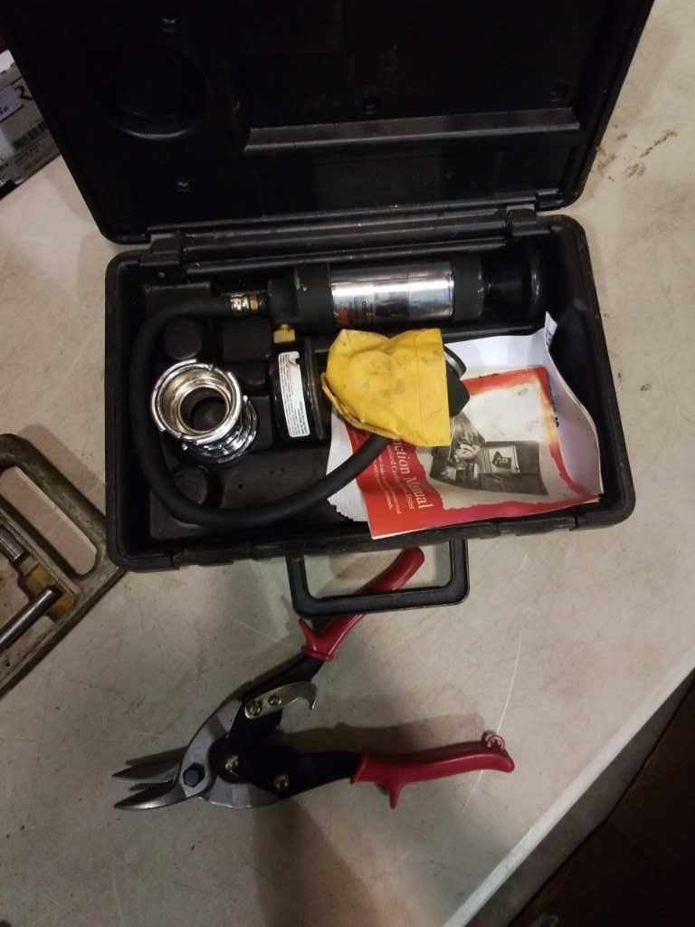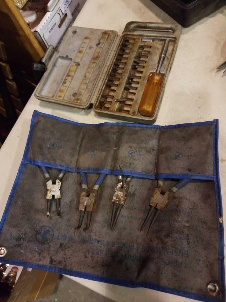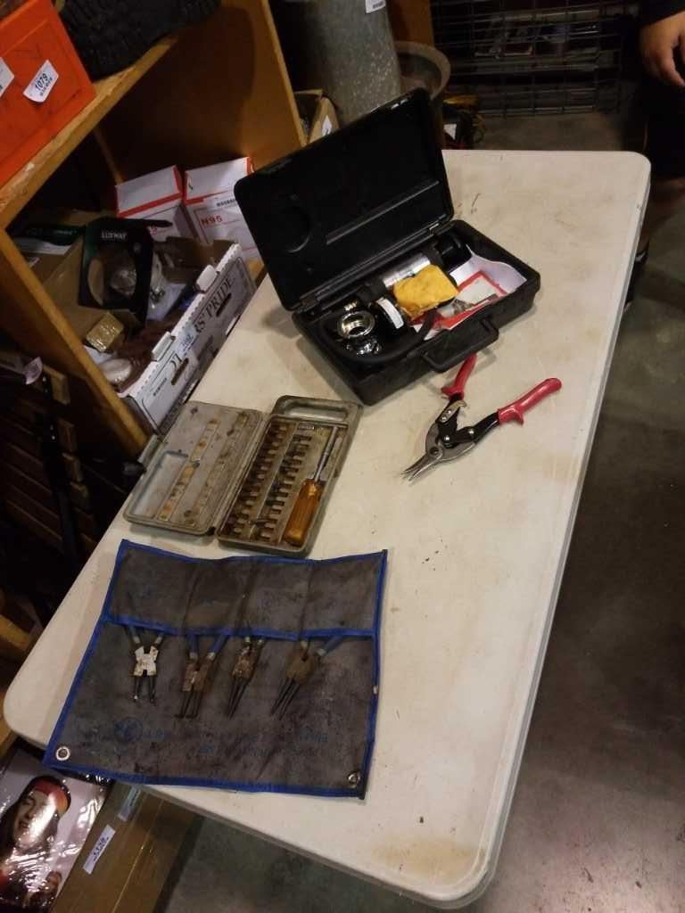 Cooling system pressure tester, bit set, tin snips and snap ring pliers