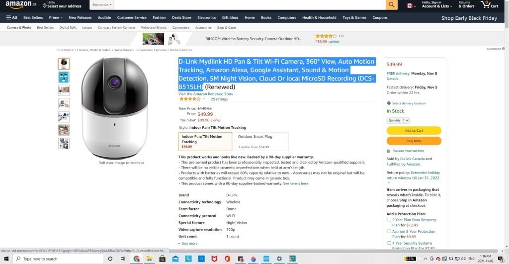 D-Link Mydlink HD Pan & Tilt Wi-Fi Camera, 360° View, Auto Motion Tracking, Amazon Alexa, Google Assistant, Sound & Motion Detection, 5M Night Vision, Cloud Or local MicroSD Recording (DCS-8515LH) Tested and Working Retail$149