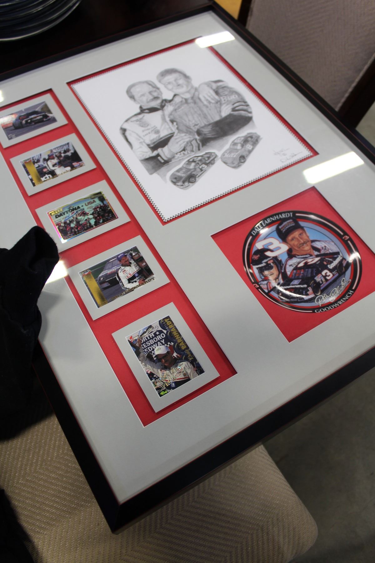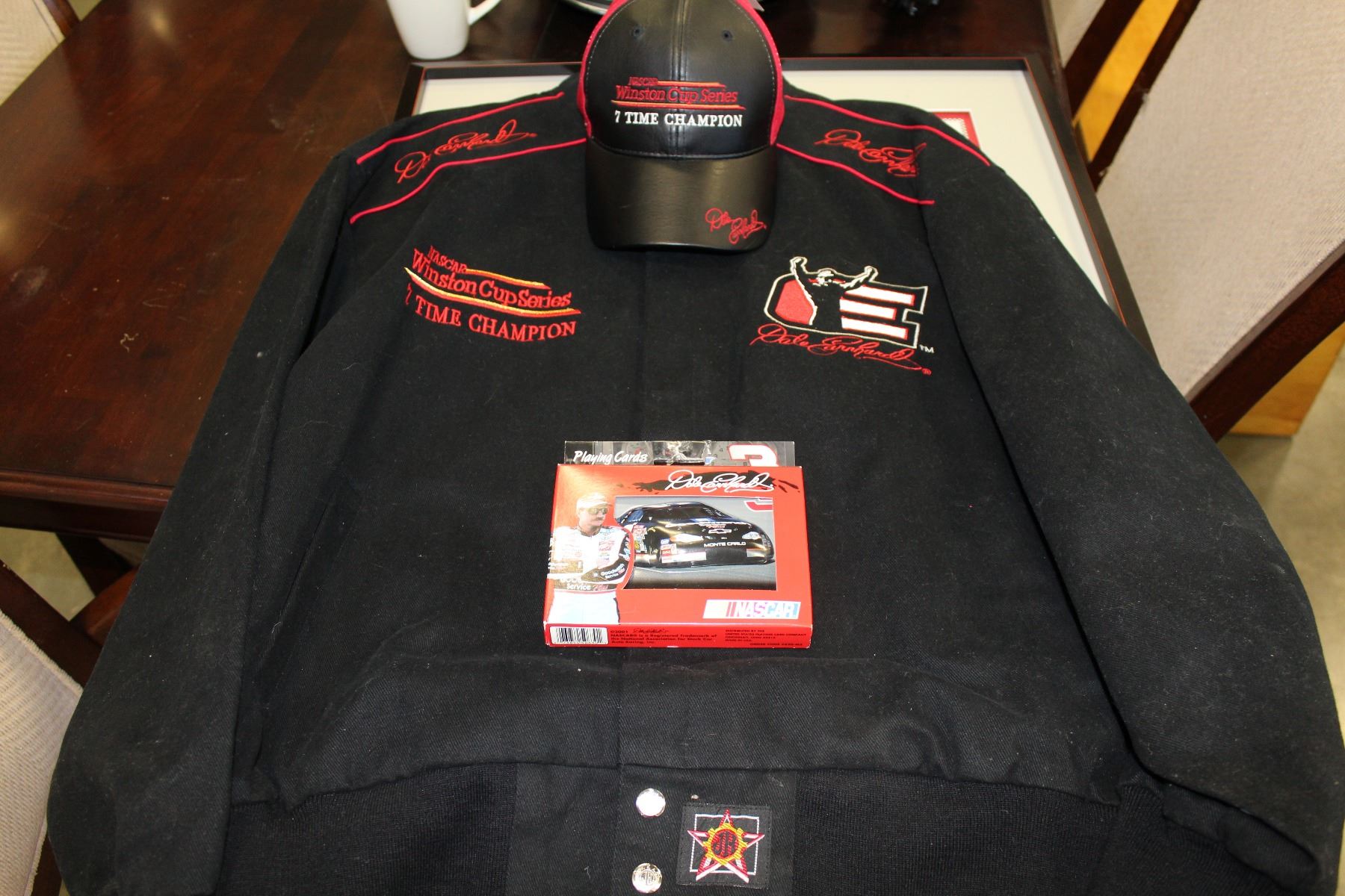 DALE EARNHARDT JACKET AND CAP AND CARDS AND FRAMED PHOTO