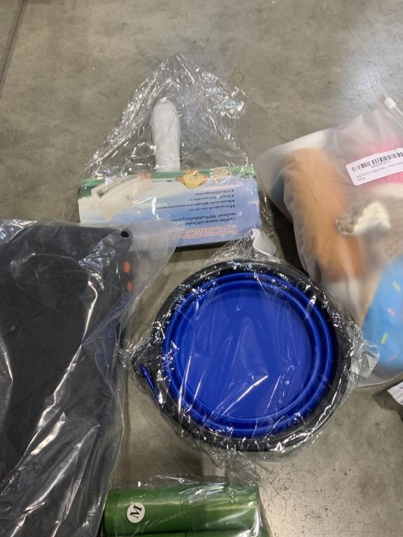 DASSORTED DOG ITEMS SUCH AS TOYS, BELLS AND WASTE BAGGIES WITH LED LIGHT AND MORE