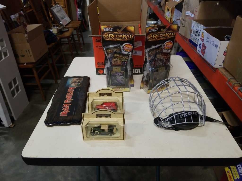 DAYS GONE DIE CAST CARS, IRON MADON BURL PICTURE AND 2 REDAKAI CARD READERS WITH BOOSTER PACKS