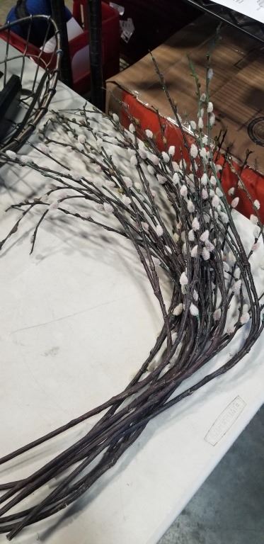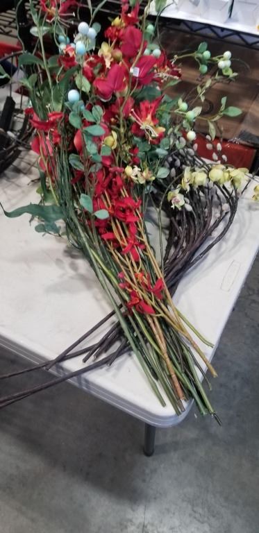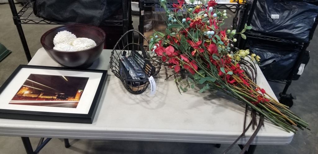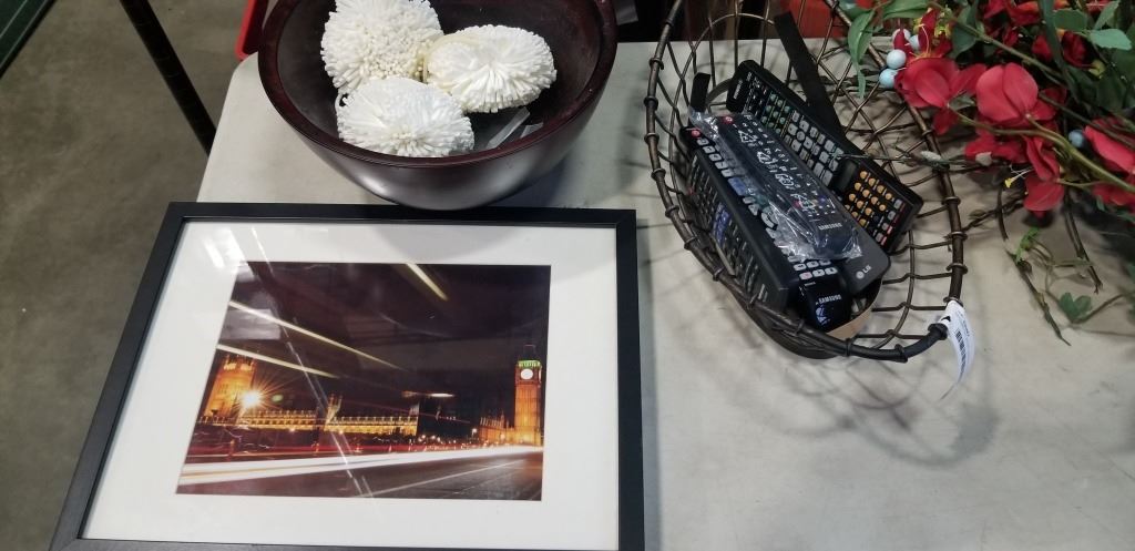 DECORATIVE BOWL, BASKET WITH REMOTES, FRAMED PICTURE AND PLANT BRANCHES