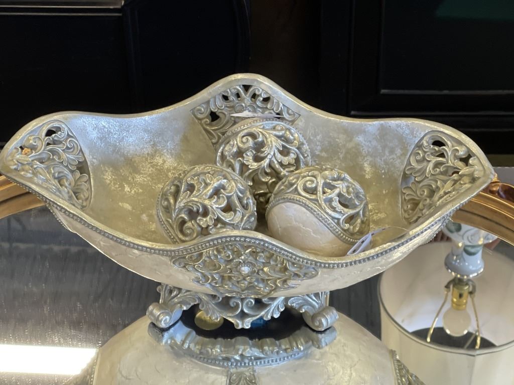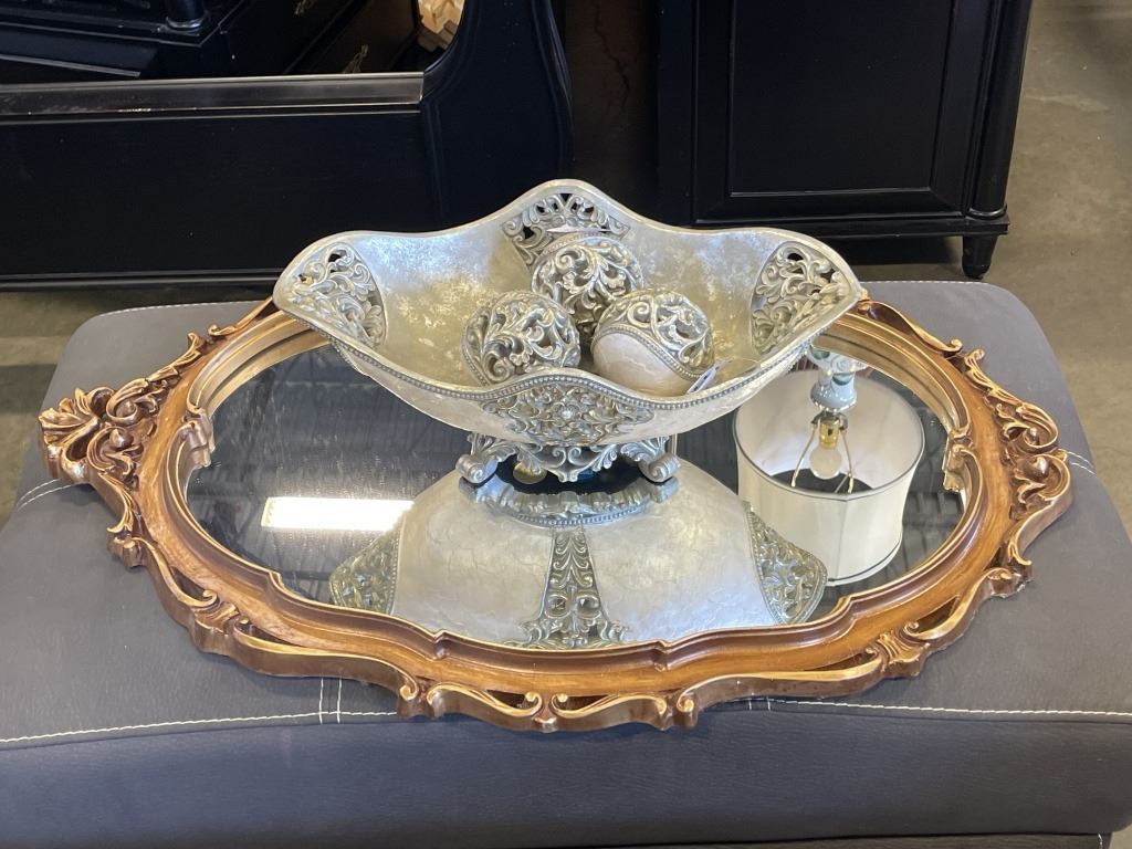 DECORATIVE CENTRE BOWL AND OVAL GOLD FRAMED MIRROR