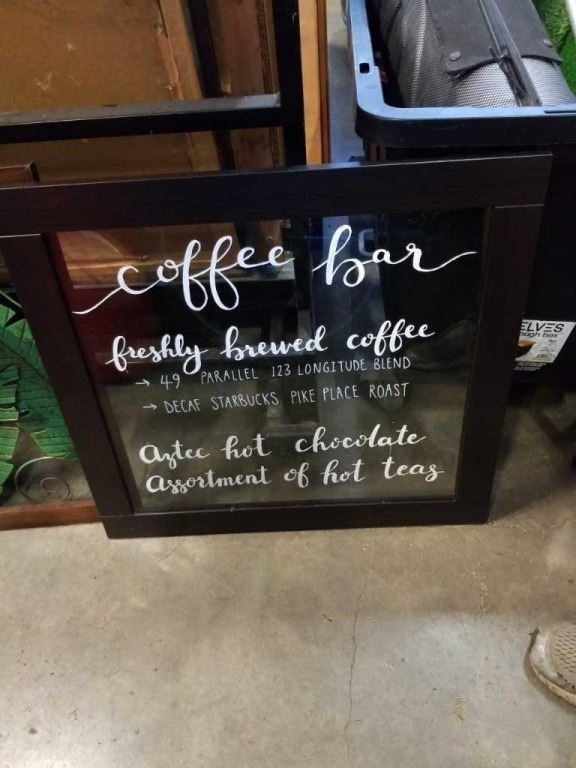 DECORATIVE METAL ART, PHOTO PIN BOARD AND COFFEE BAR FRAMED GLASS PANEL