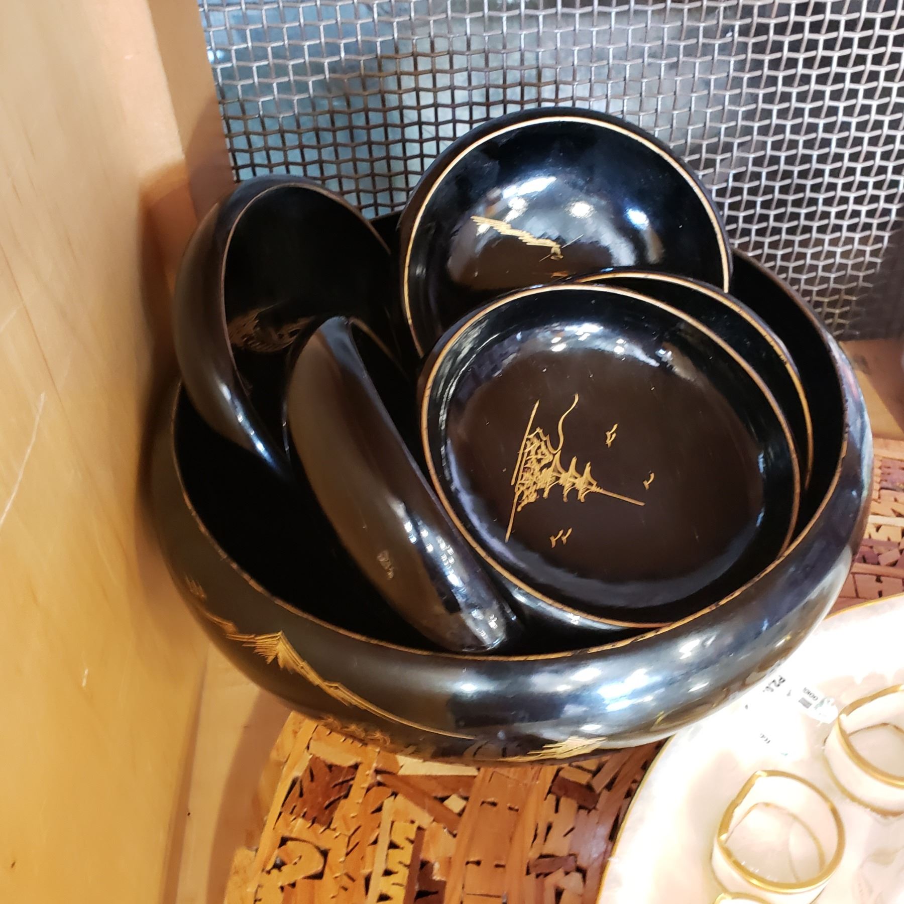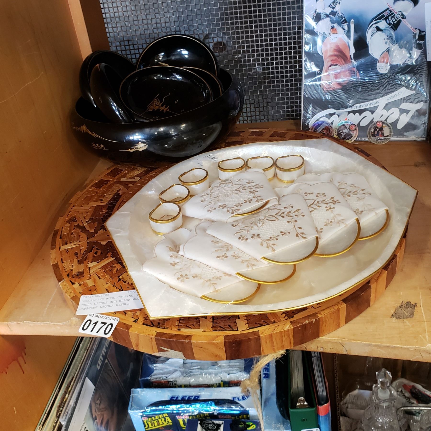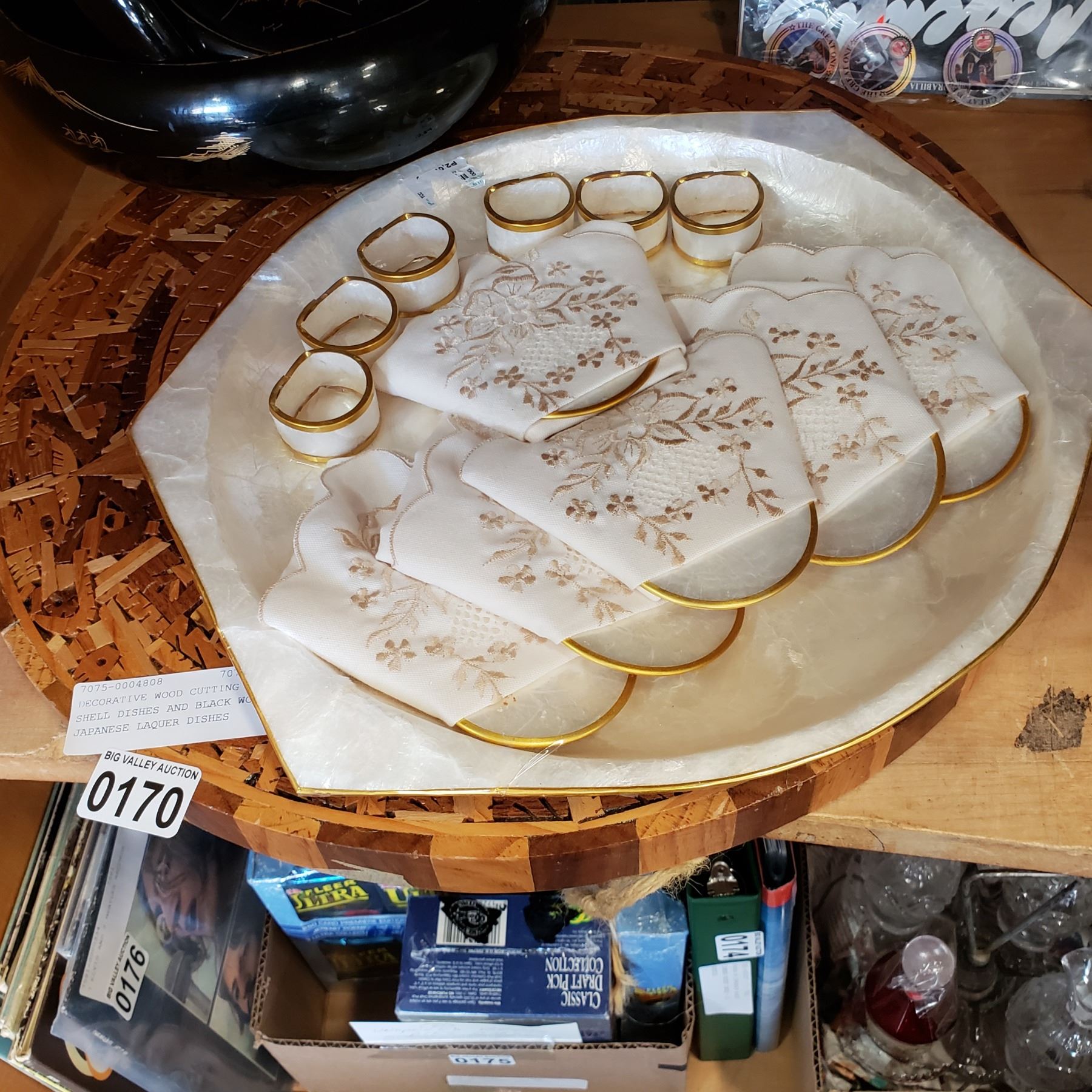 DECORATIVE WOOD CUTTING BOARD, SHELL DISHES AND BLACK WOODEN JAPANESE LAQUER DISHES