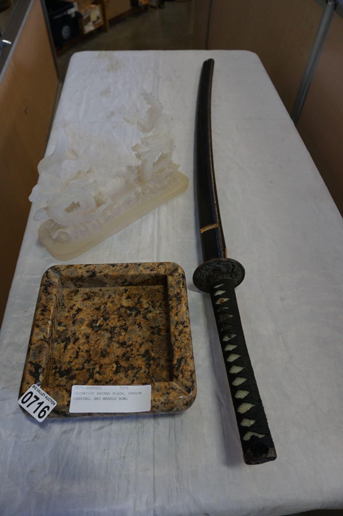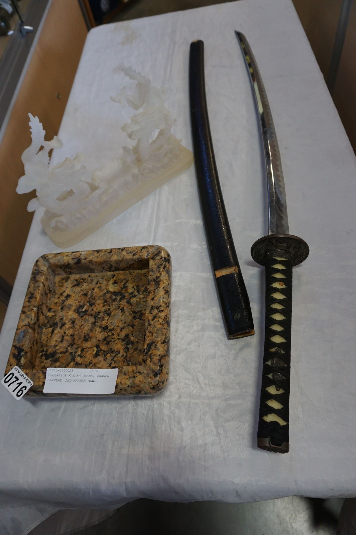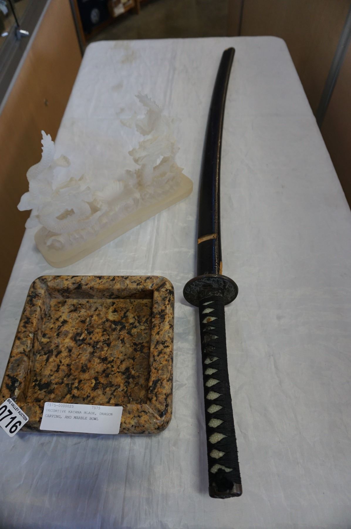 DECORTIVE KATANA BLADE, DRAGON CARVING, AND MARBLE BOWL