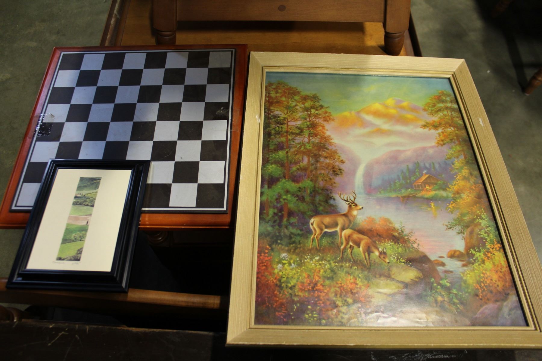 DEER WATERFAL AND WAINBOW PRINT WITH WATER COLOR SIGNED PAINTING AND CHESS BOARD
