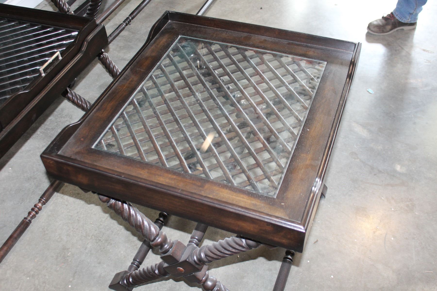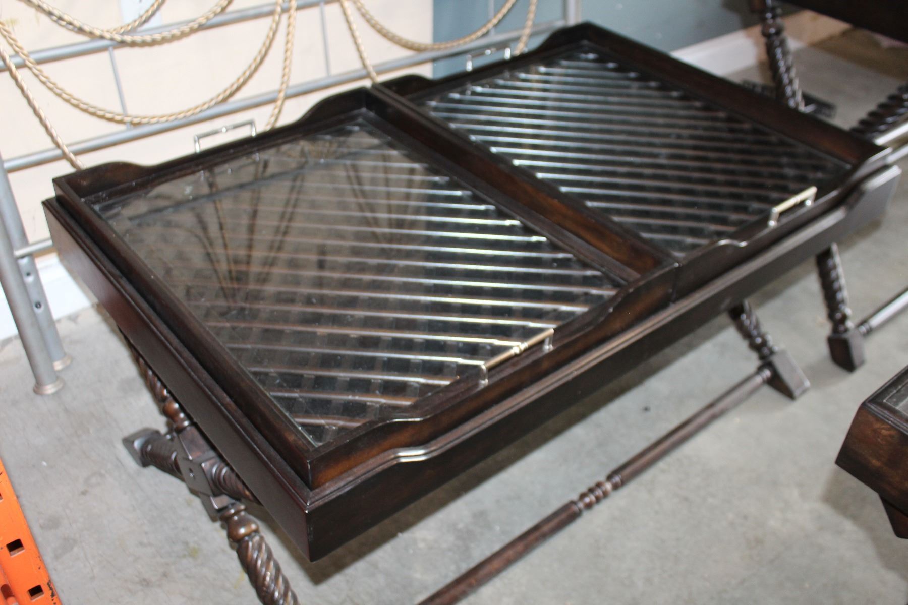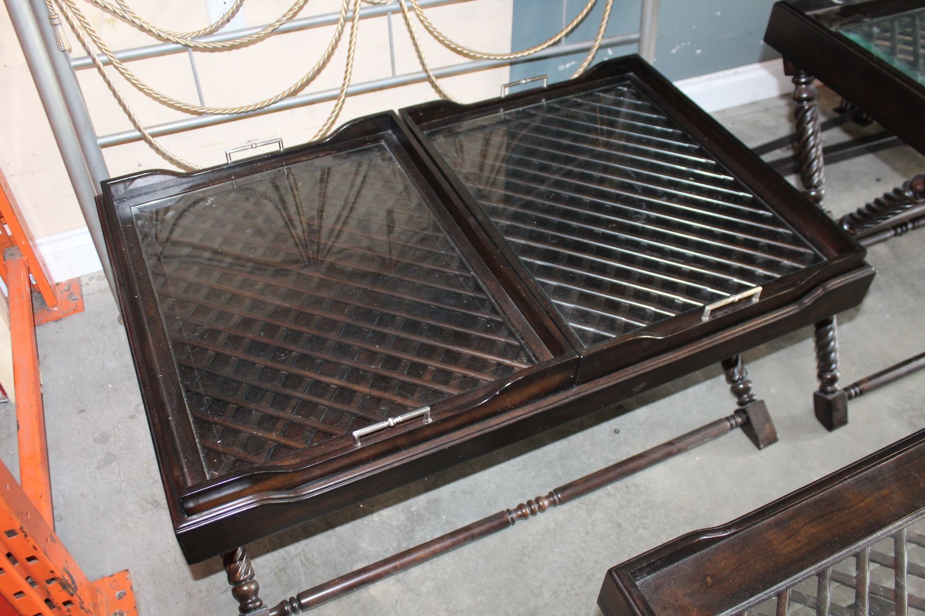 DESIGNER COFFEE TABLE AND ENDTABLE WITH FIVE SERVING TRAYS BEVELLED GLASS TOP