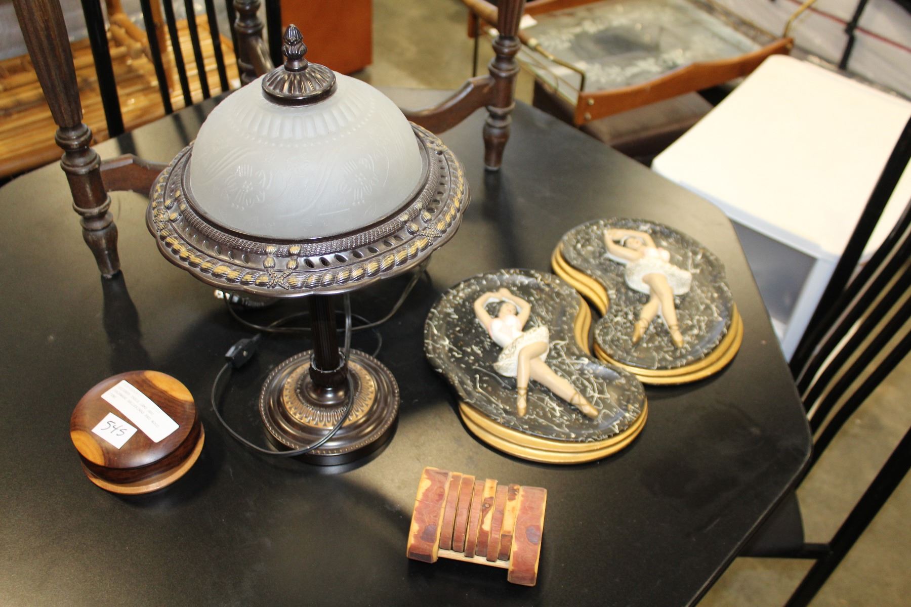 DESIGNER TABLE LAMP AND CHALKWARE BALLERINAS AND WOOD ITEMS