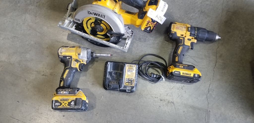 DEWALT 20V VORDLESS TOOL SET WITH CIRCULAR SDAW, IMPACT GUN AND DRILL, WITH 2 4AH BATTERIES, ONE 2AH