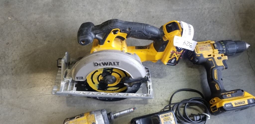 DEWALT 20V VORDLESS TOOL SET WITH CIRCULAR SDAW, IMPACT GUN AND DRILL, WITH 2 4AH BATTERIES, ONE 2AH. CHARGER AND CARRY BAG, TESTED WORKING