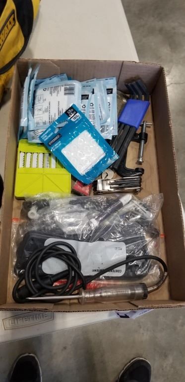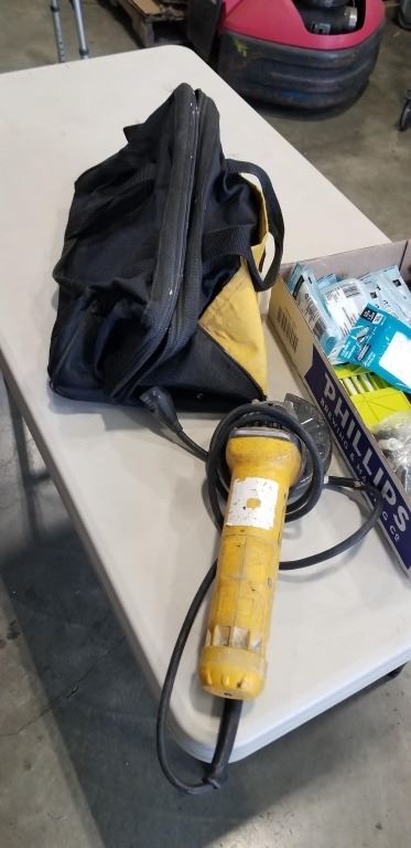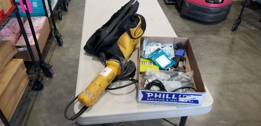 DEWALT 4.5 INCH ANGLE GRINDER AND TRAY OF SHOP TOOLS AND SUPPLY