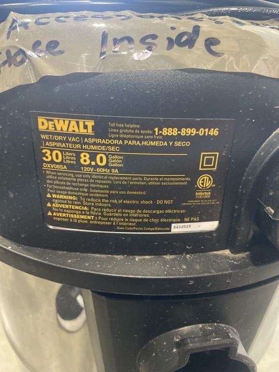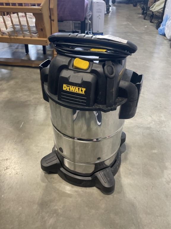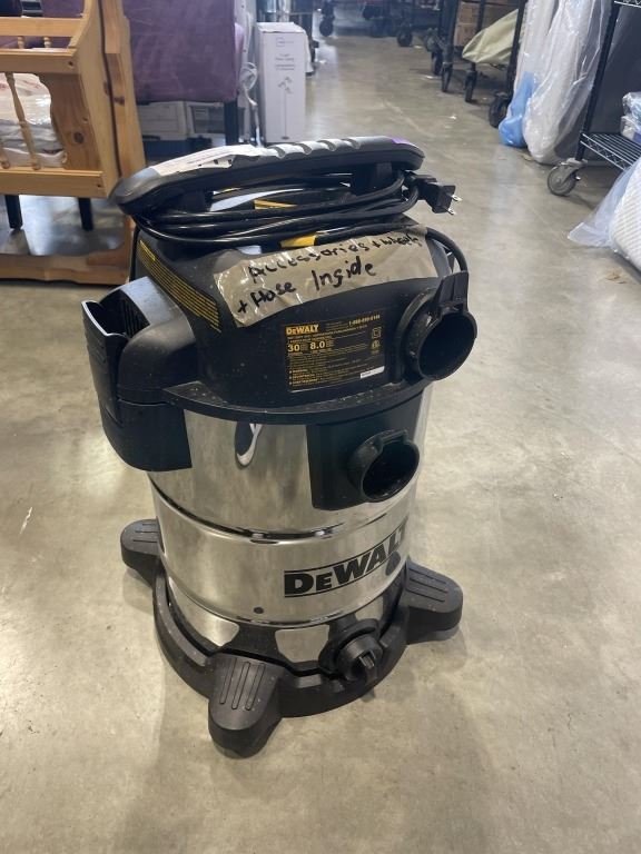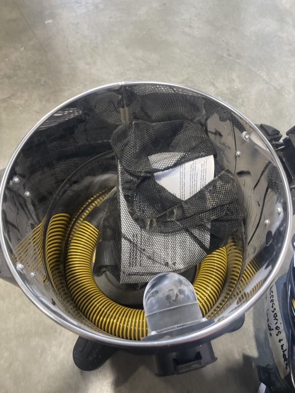 DEWALT 8 GALLON STAINLESS SHOP VAC WORKING HOSE AND ACCESSORIES