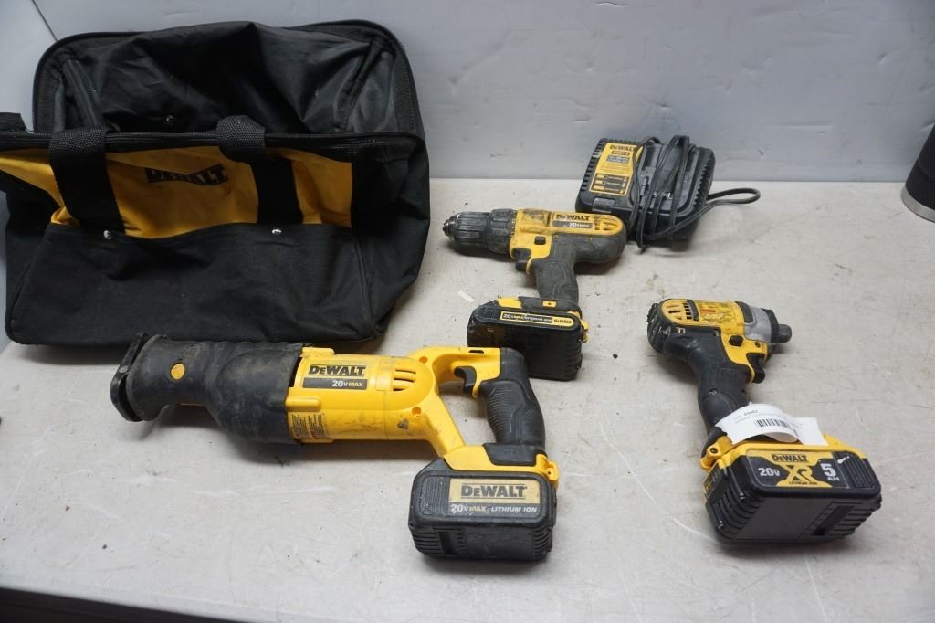 DEWALT CORDLESS TOOL SET - IMPACT GUN, DRILL, VARIABLE SPEED RECIPROCATING SAW, 3 BATTERIES AND CHARGER - TESTED WORKING