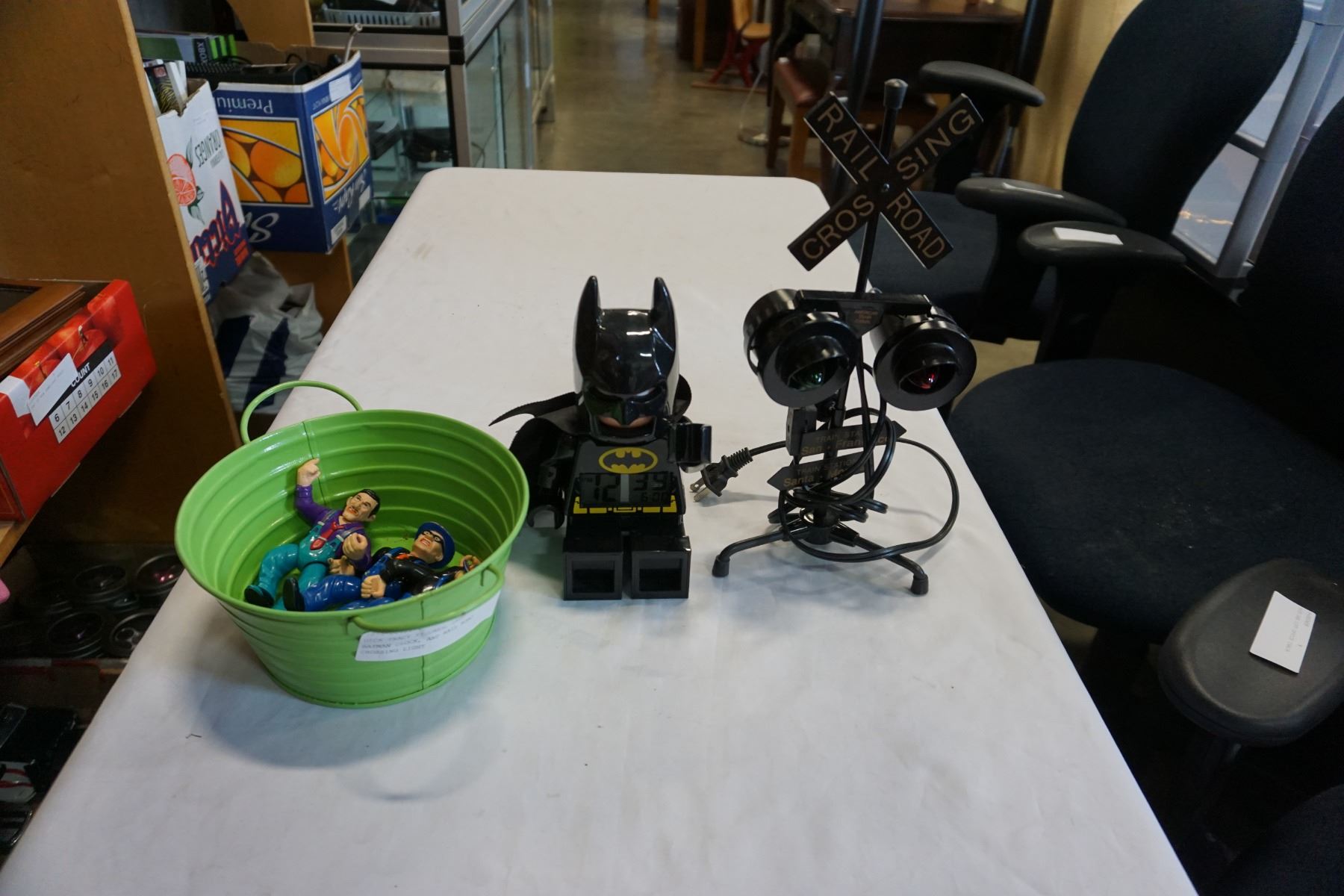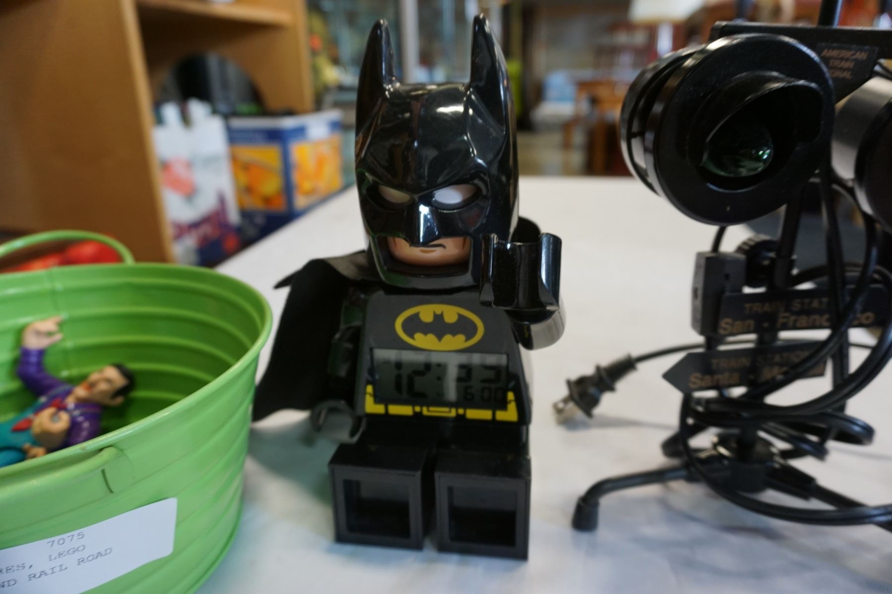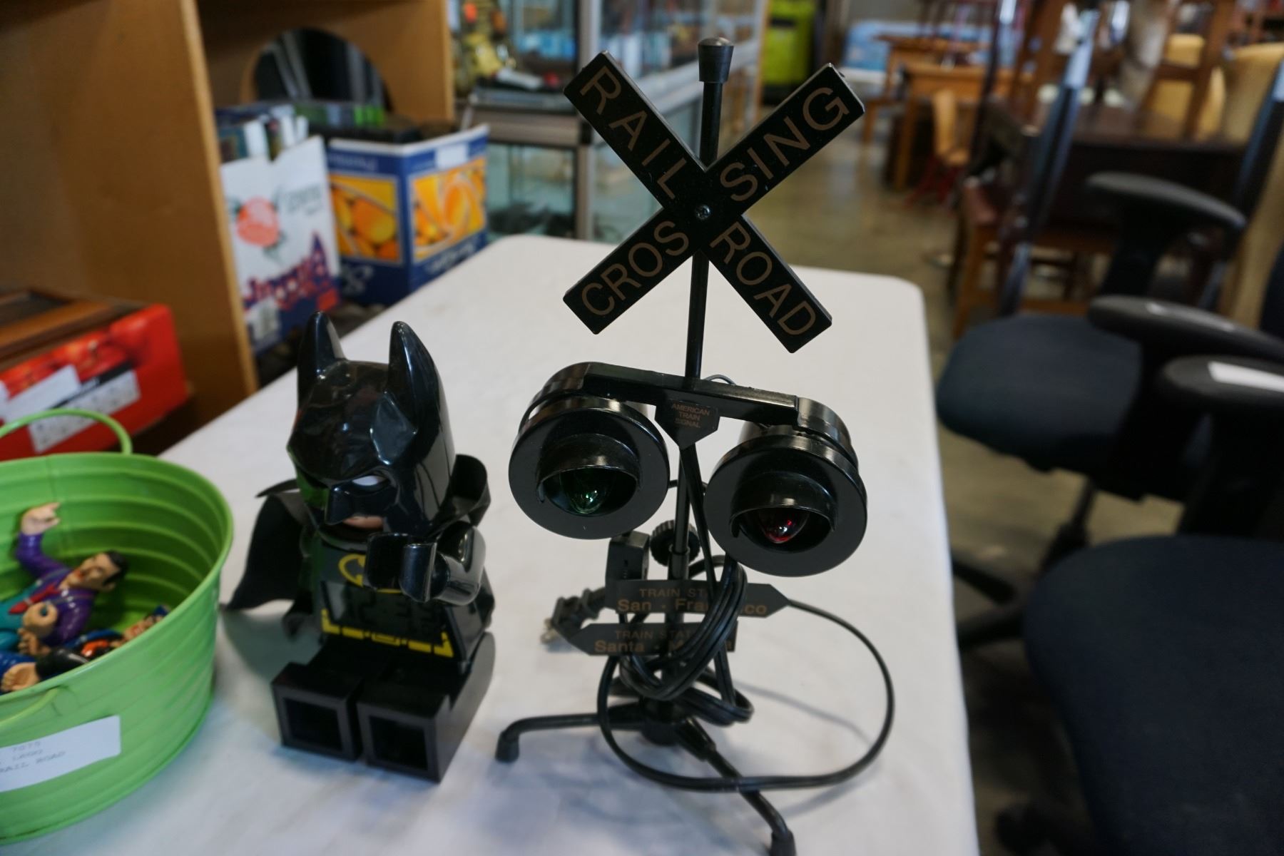 DICK TRACY FIGURES, LEGO BATMAN CLOCK, AND RAIL ROAD CROSSING LIGHT