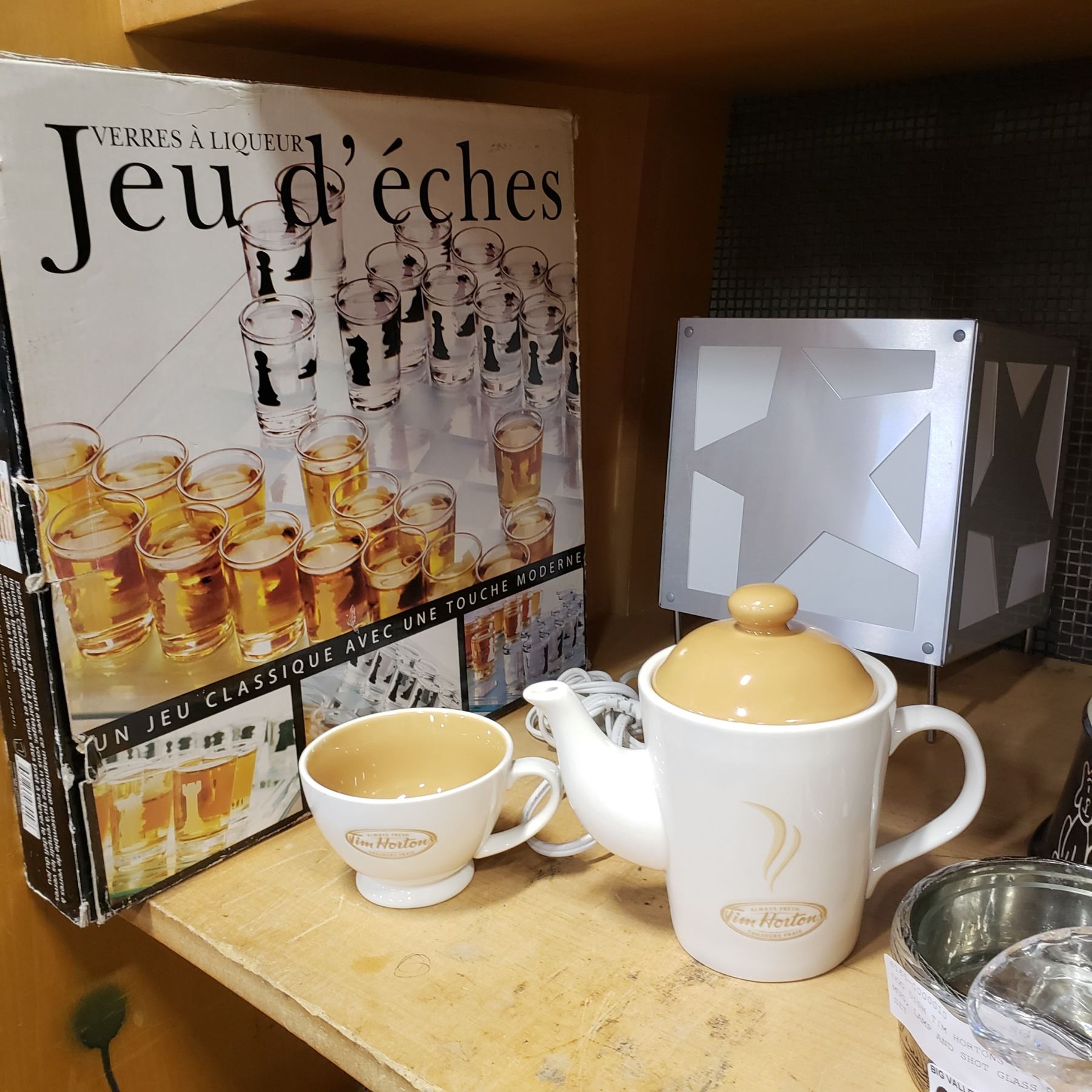 DOG DISH TIM HORTONS TEAPOT, MUG, LAMP AND SHOT GLASS CHESS SET