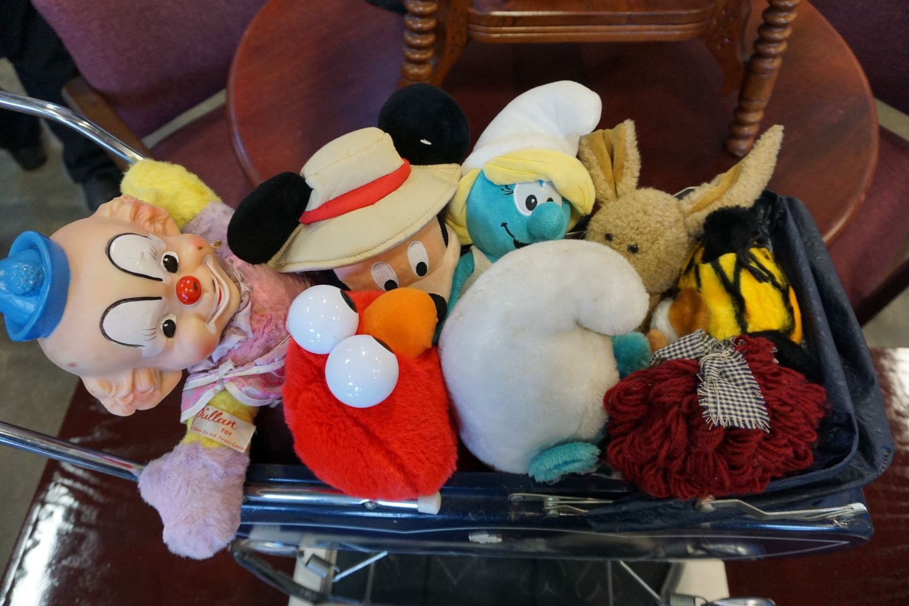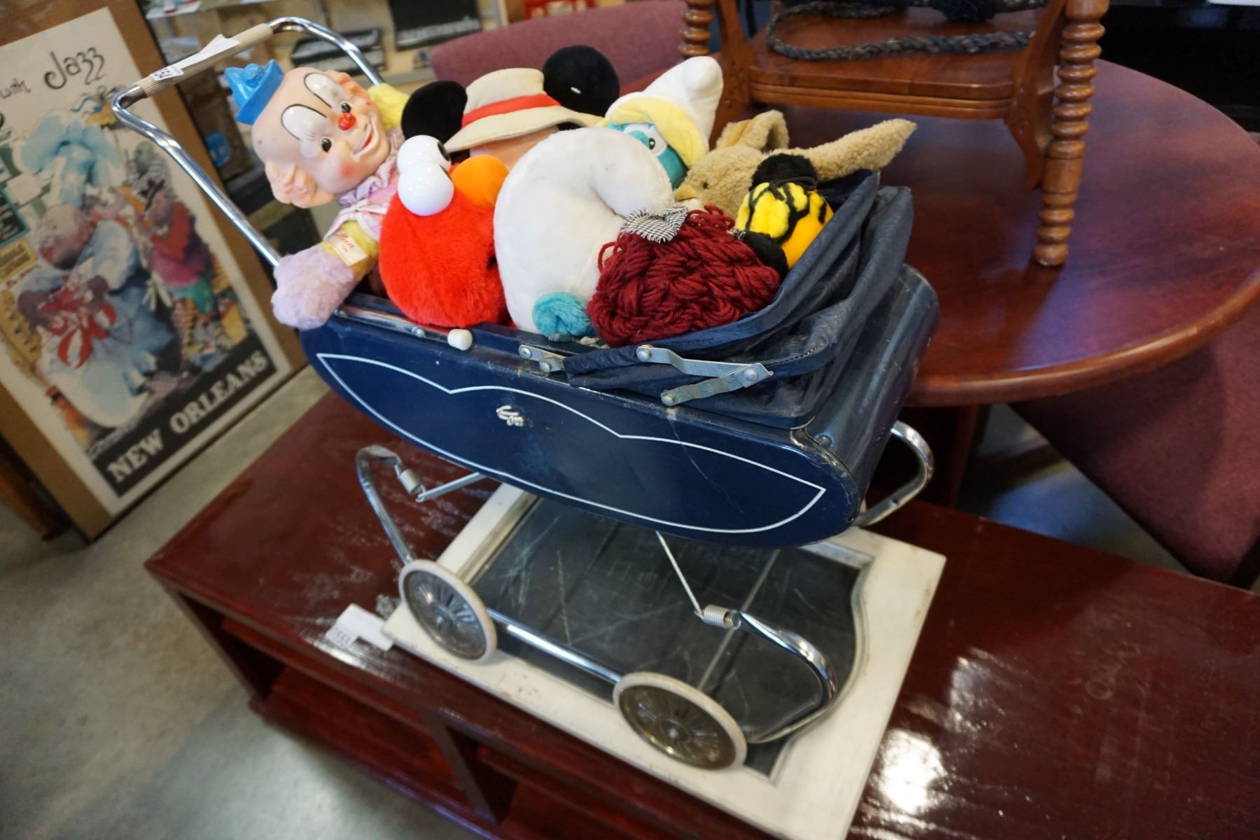 DOLL PRAM, DOLLS, STUFFIES AND CHALKBOARD