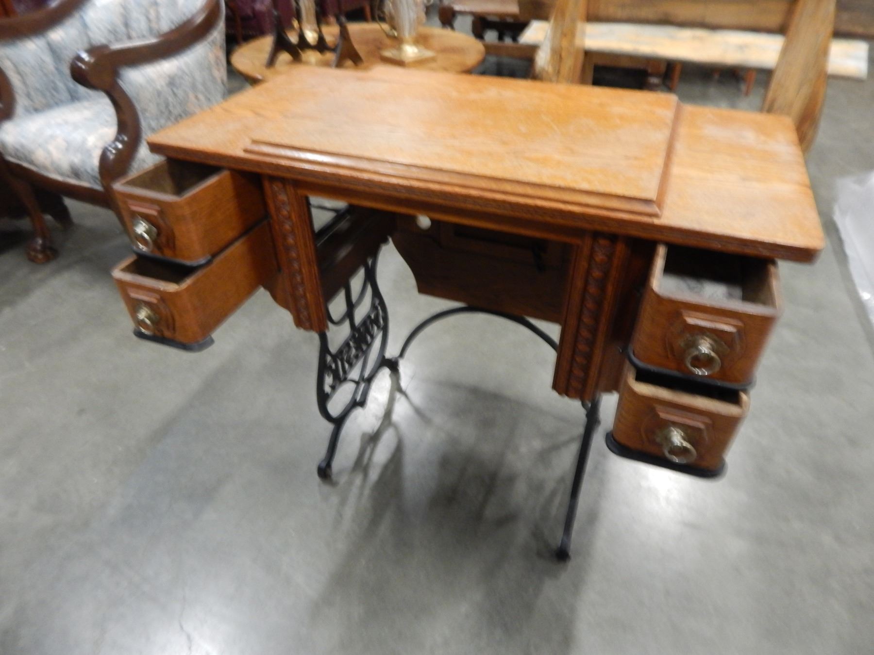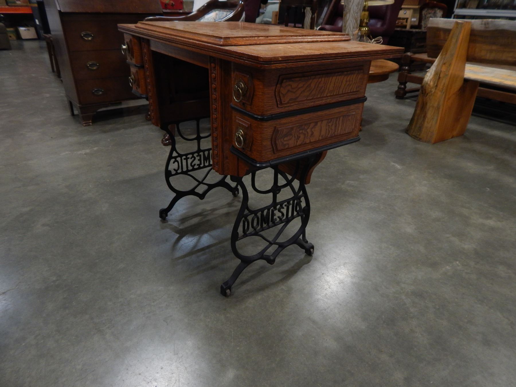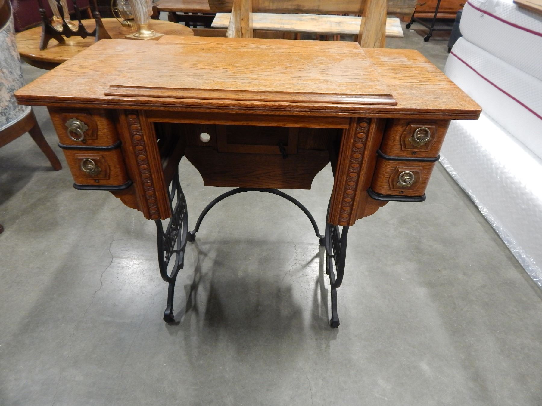 DOMESTIC OAK SEWING TABLE W/ CAST IRON LEGS