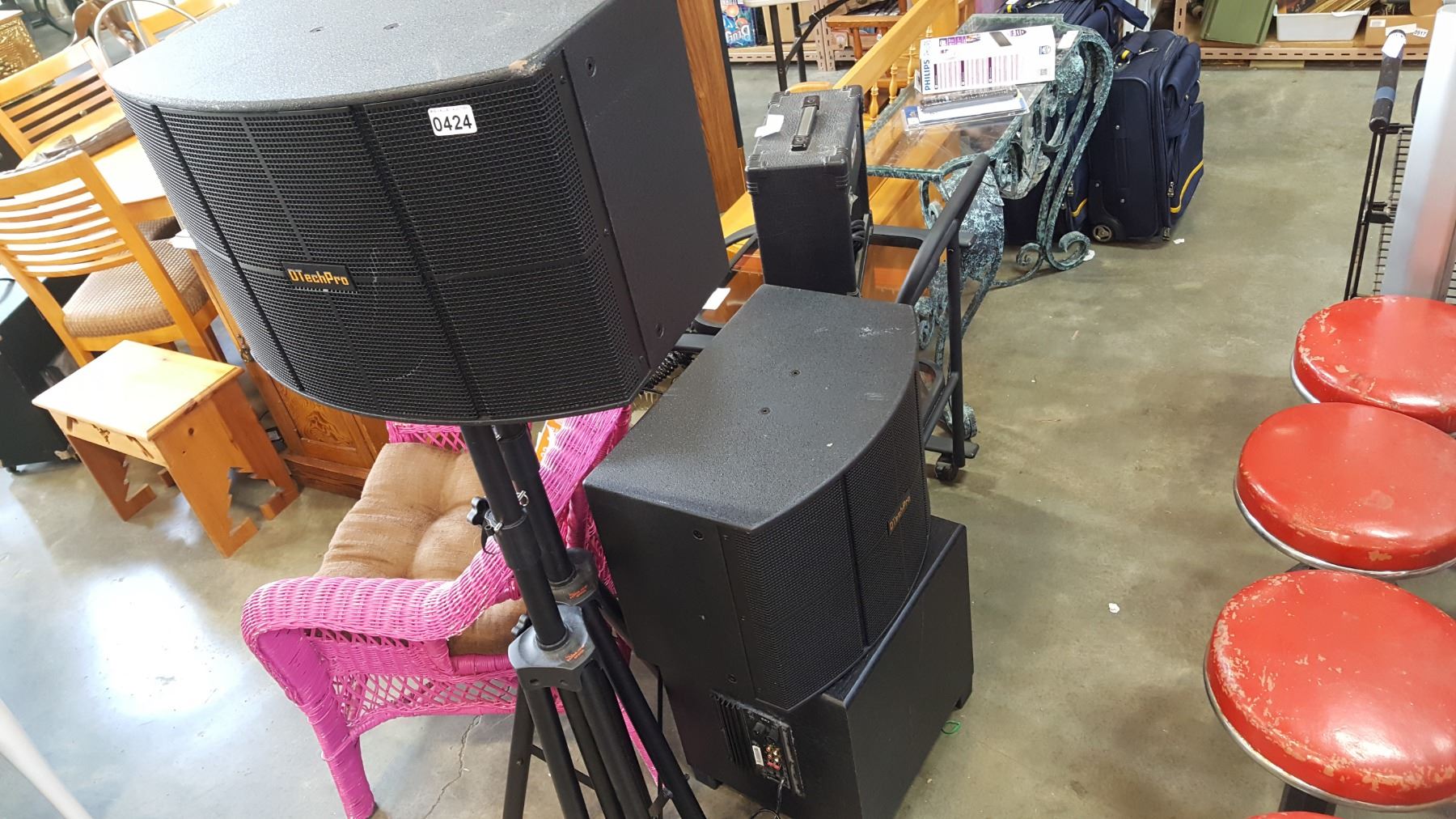DTECHPRO D T 59 W/ 2 DTECHPRO SP62 SPEAKERS W/ STAND AND DVD KARAOKE MACHINE