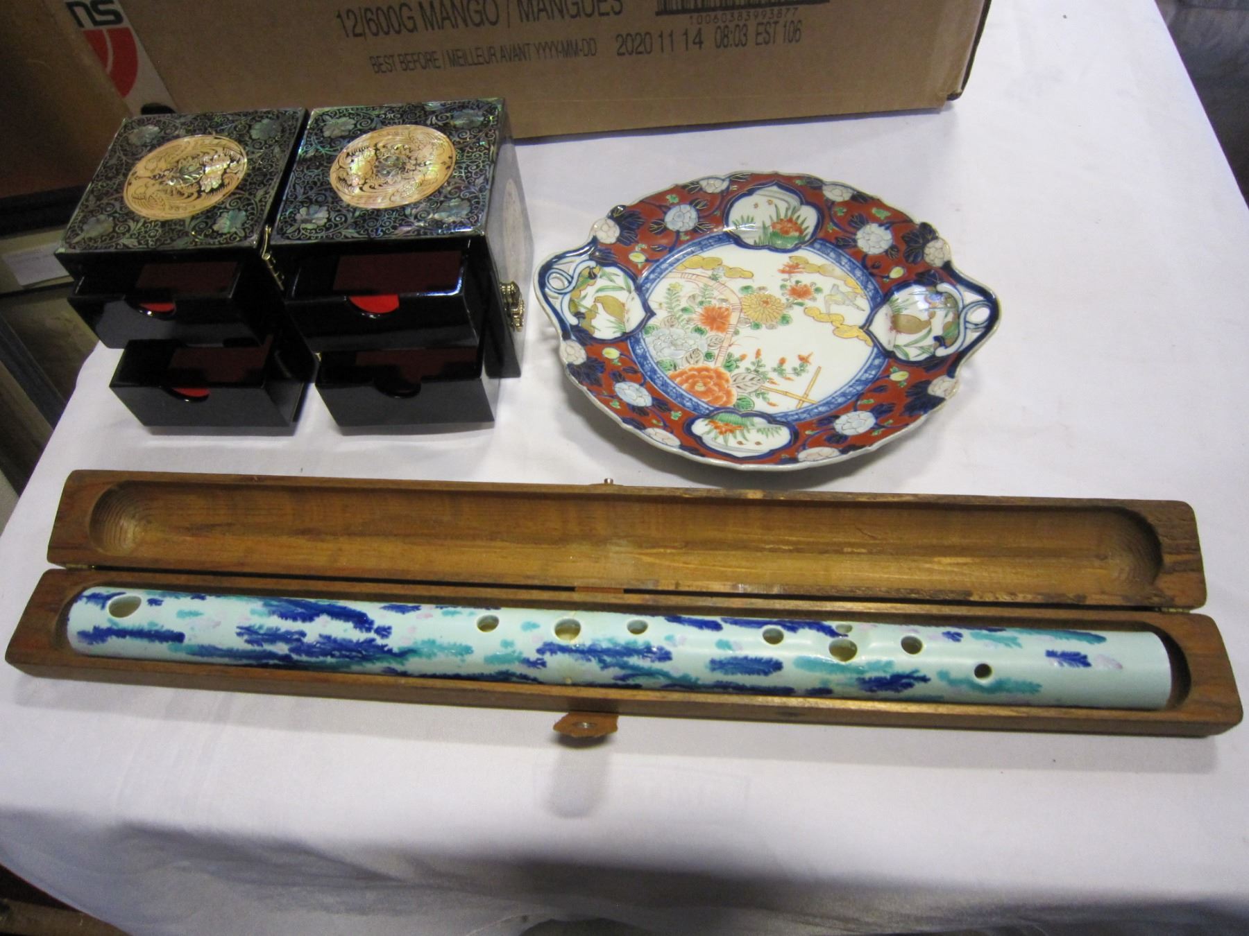 EASTERN FLUTE AS IS, LAQUER JEWELERY BOX AND PLATE