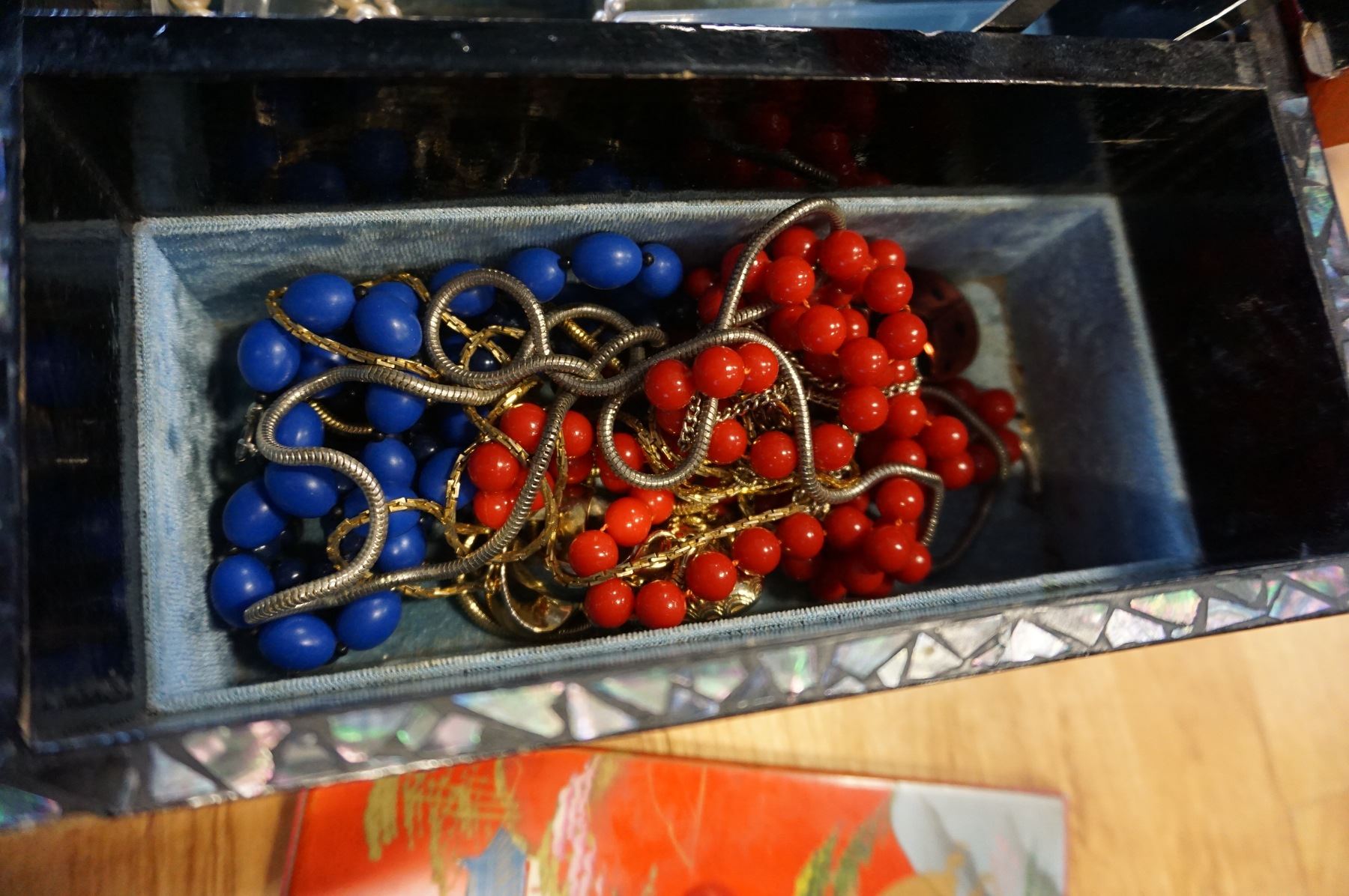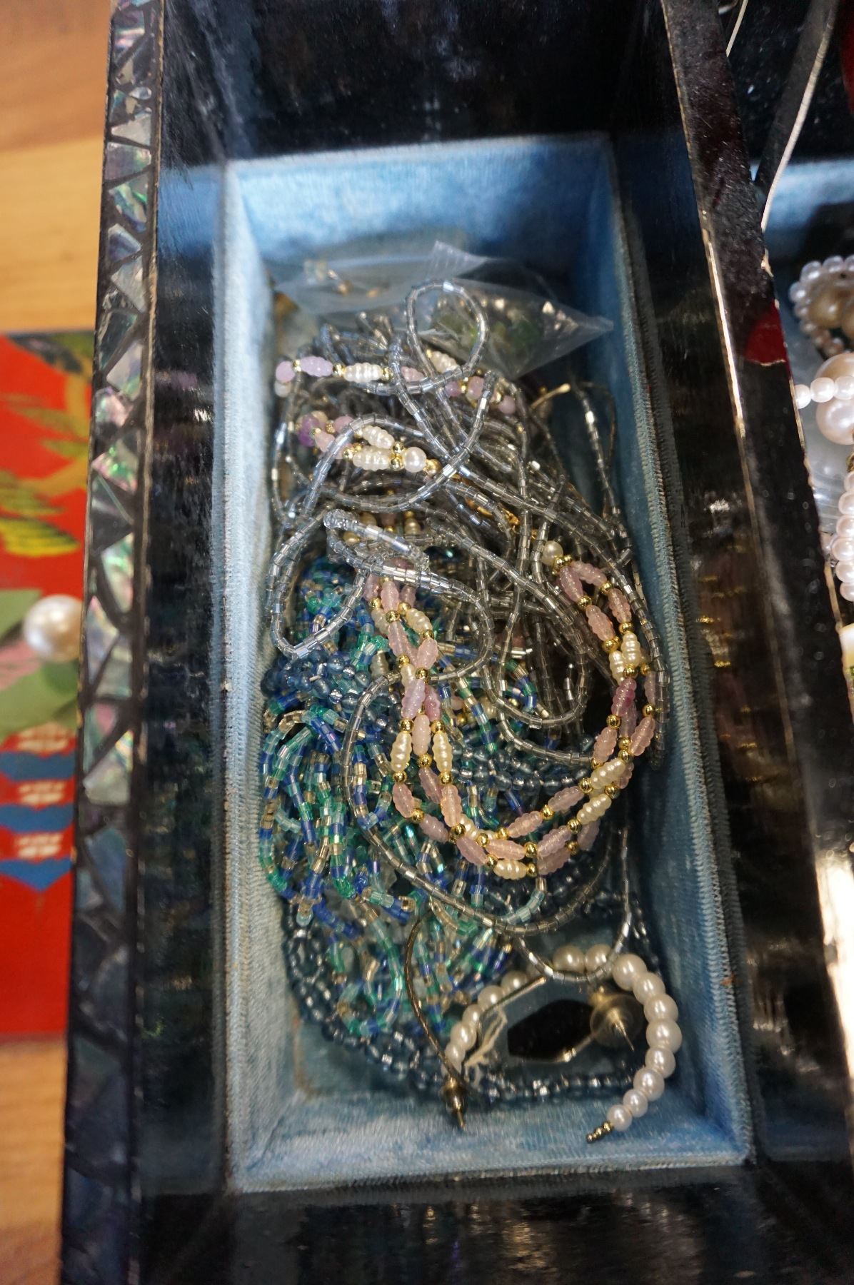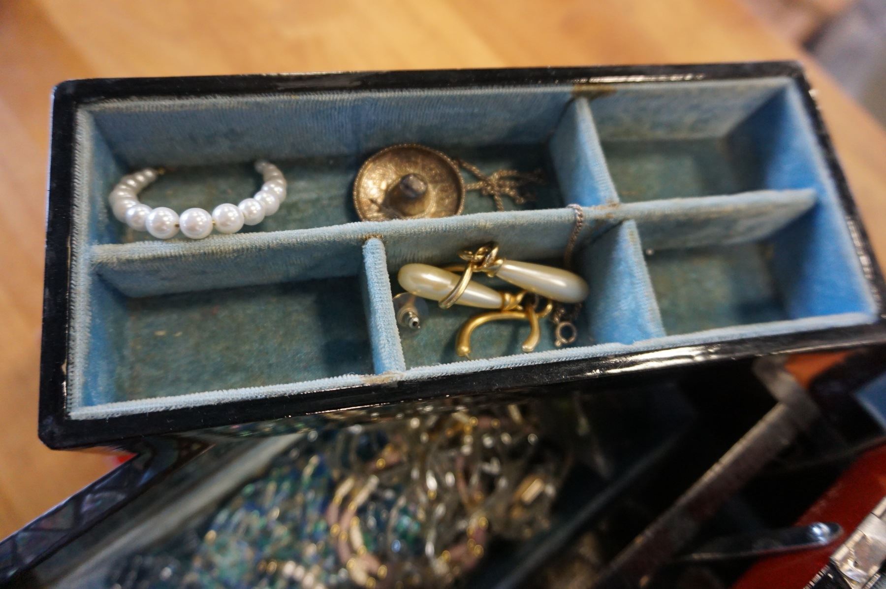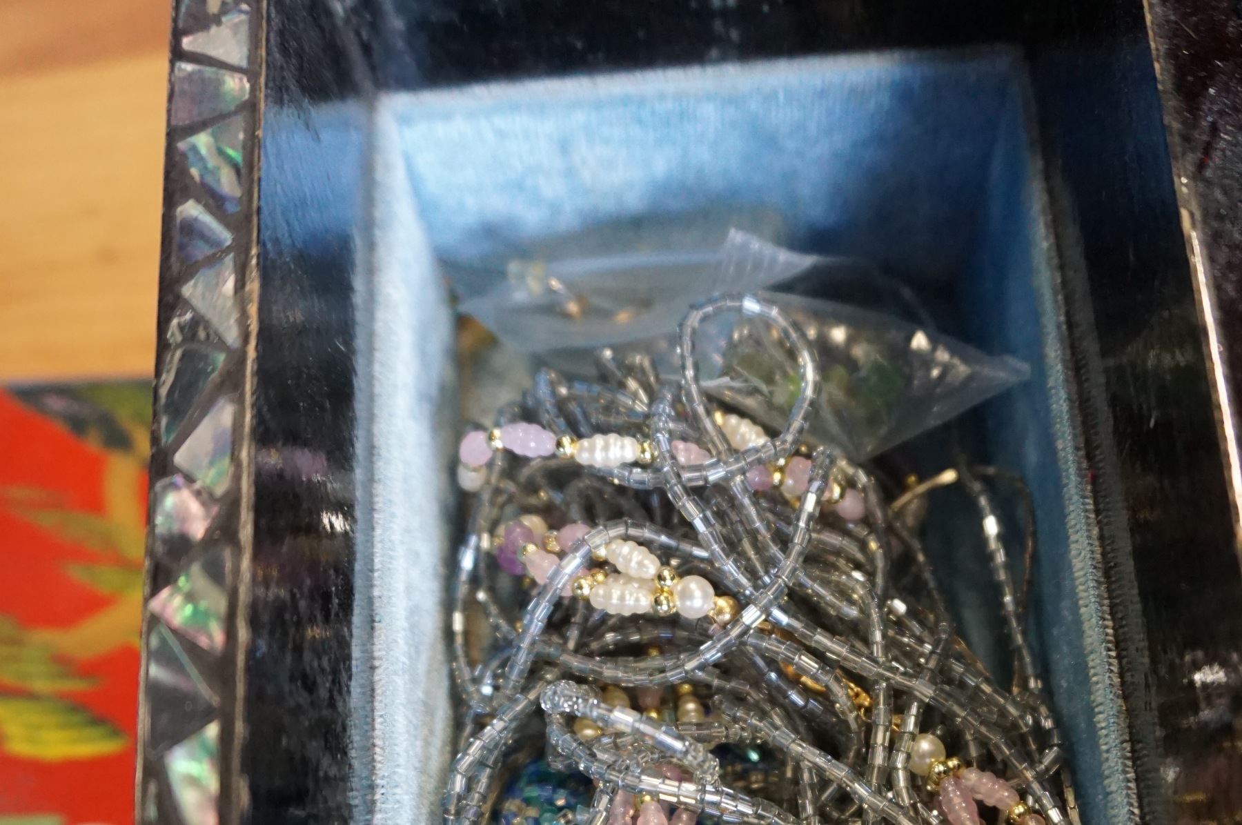 EASTERN JEWELRY BOX WITH PEARL INLAY ALSO WITH CONTENTS