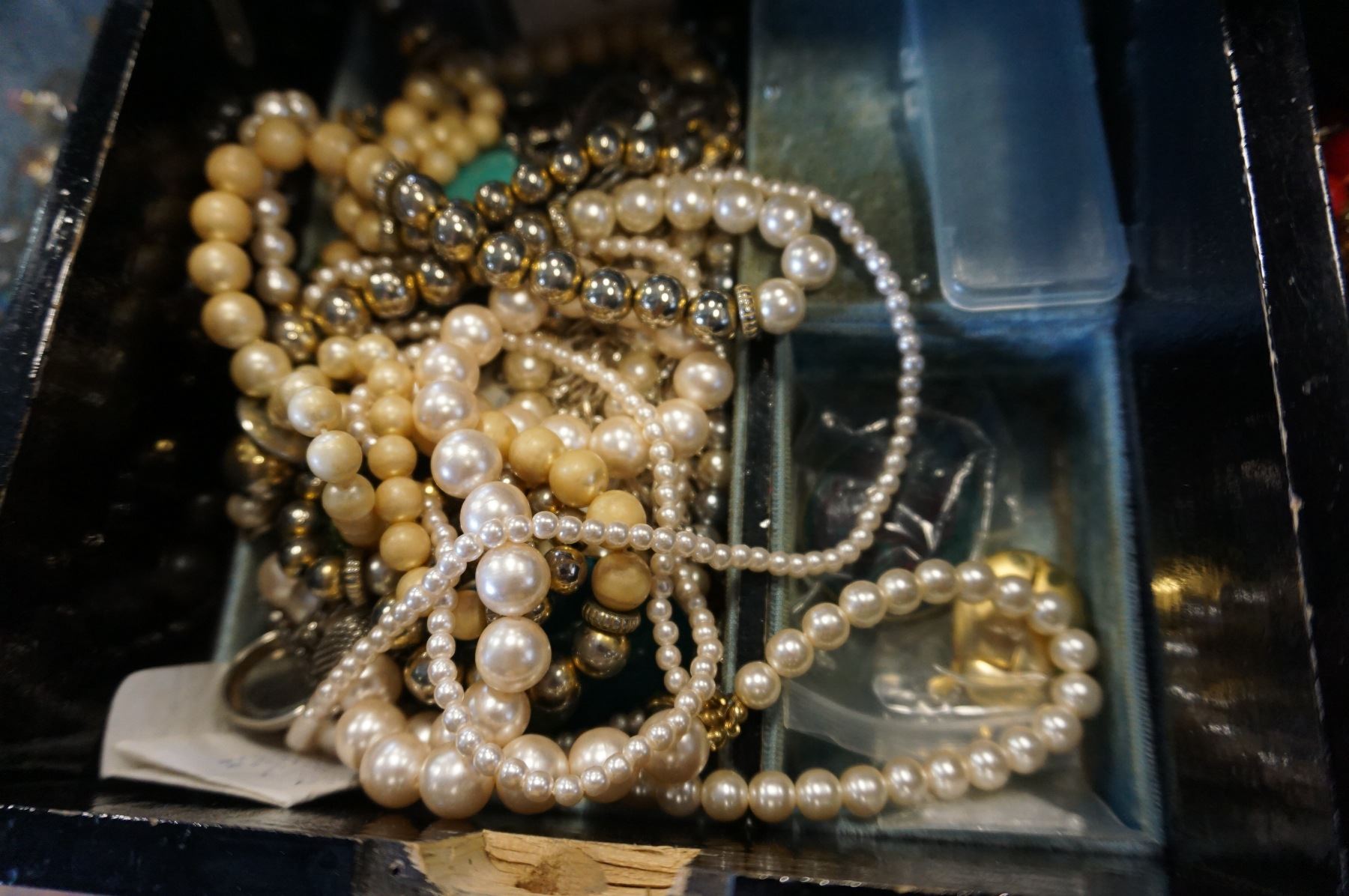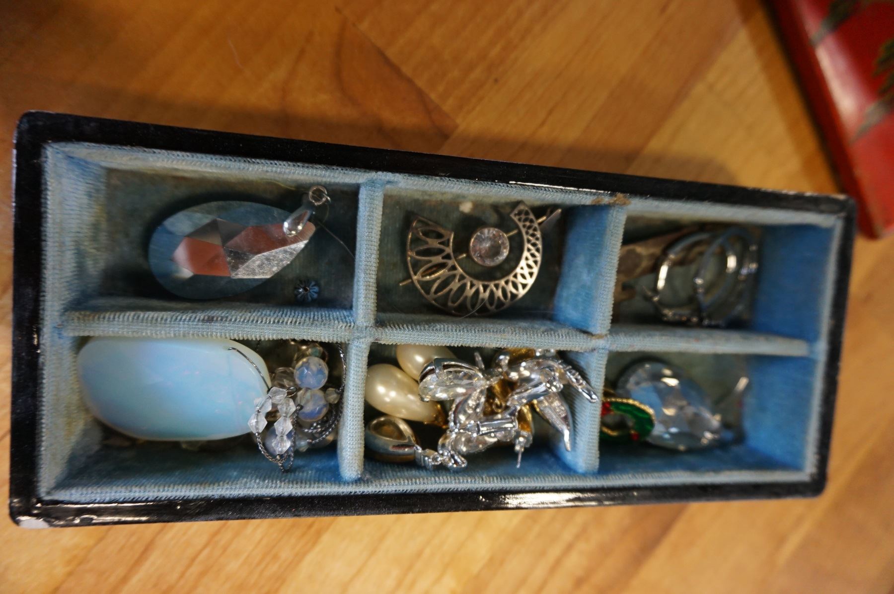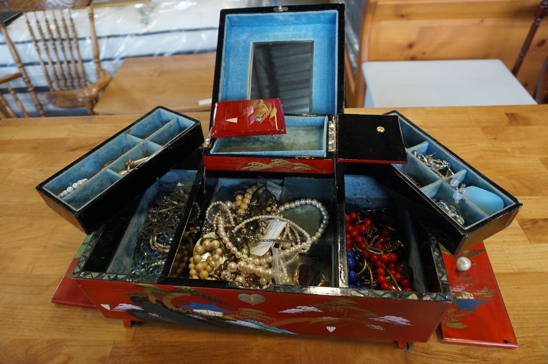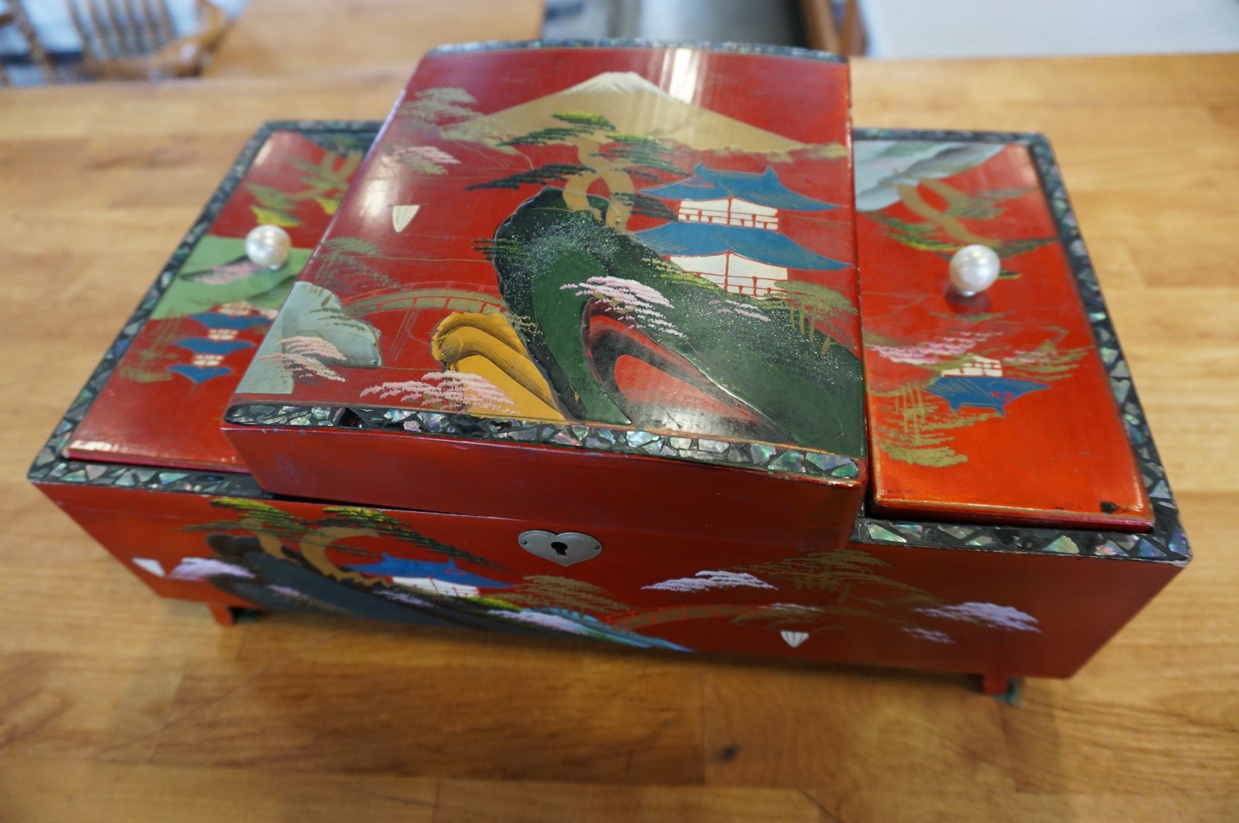 EASTERN JEWELRY BOX WITH PEARL INLAY ALSO WITH CONTENTS
