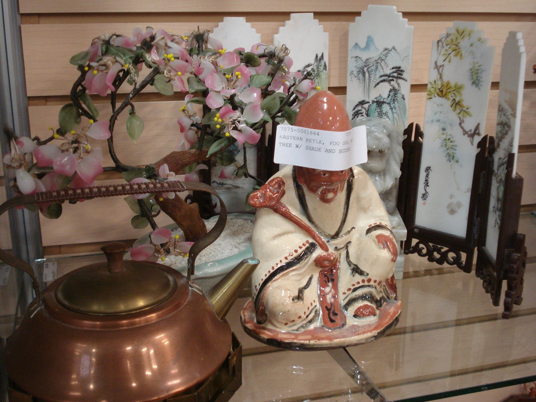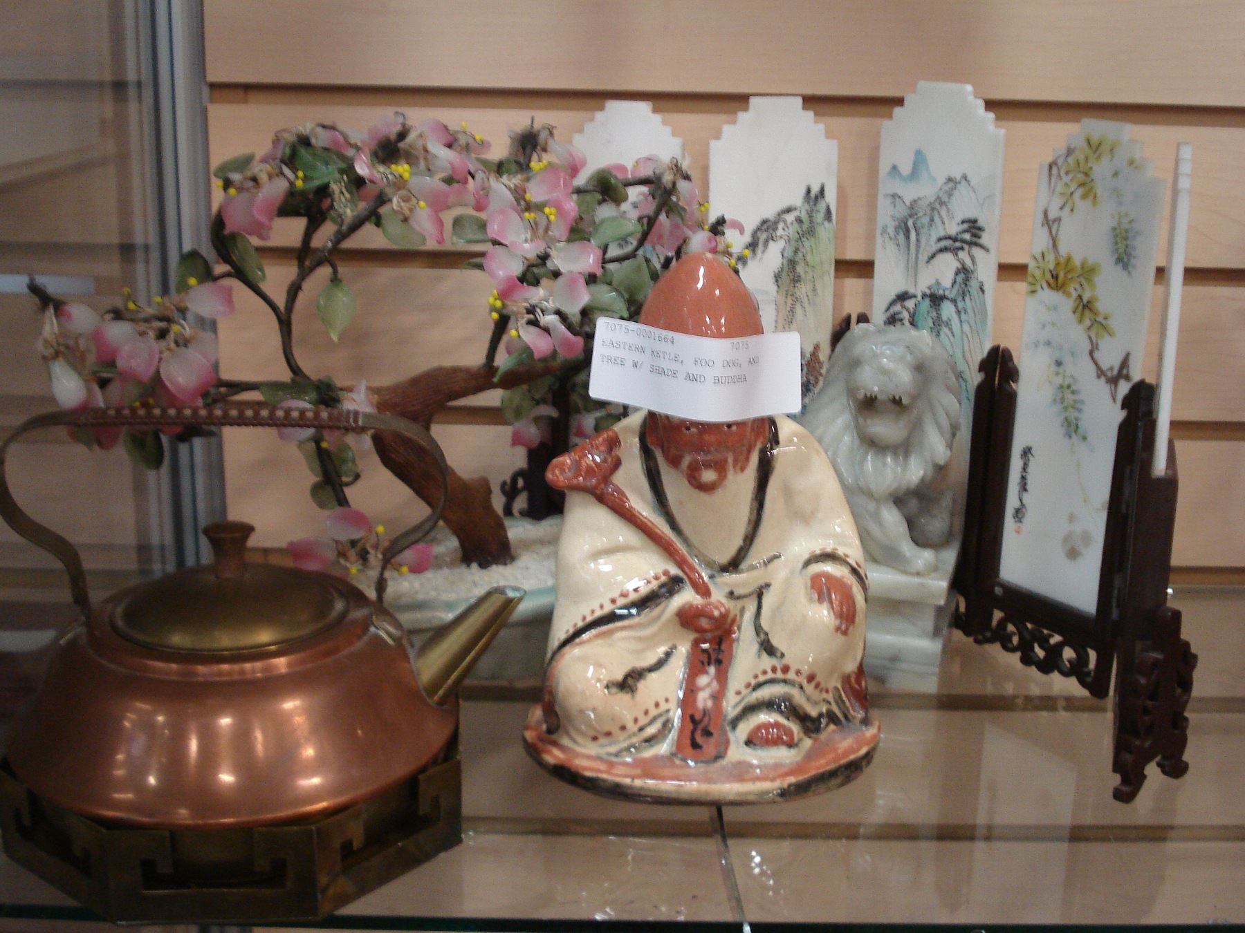 EASTERN KETLE, FOO DOG, AND TREE W/ SHADE AND BUDDHA
