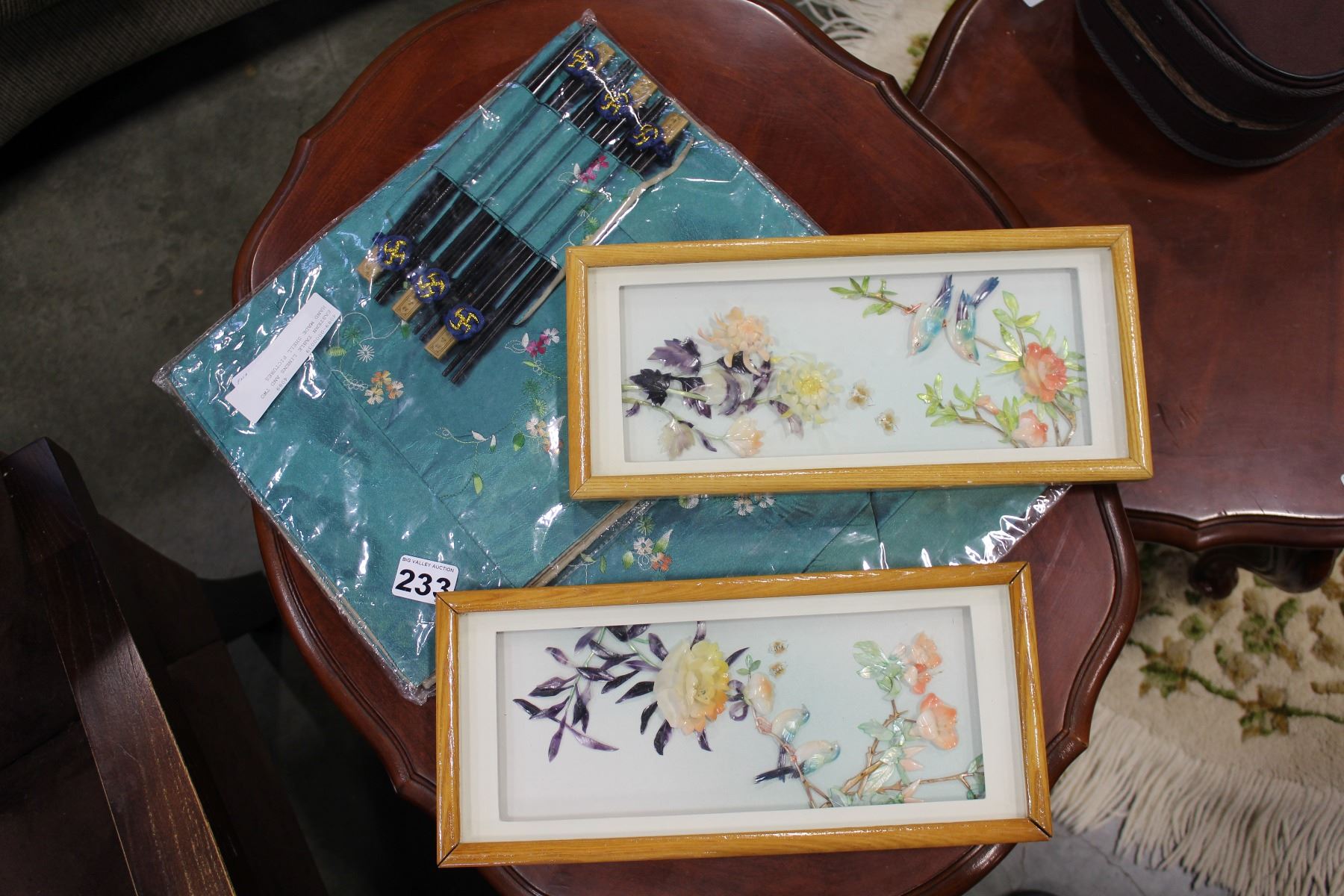 EASTERN TABLE LINENS AND TWO HAND MADE SHELL PICTURES