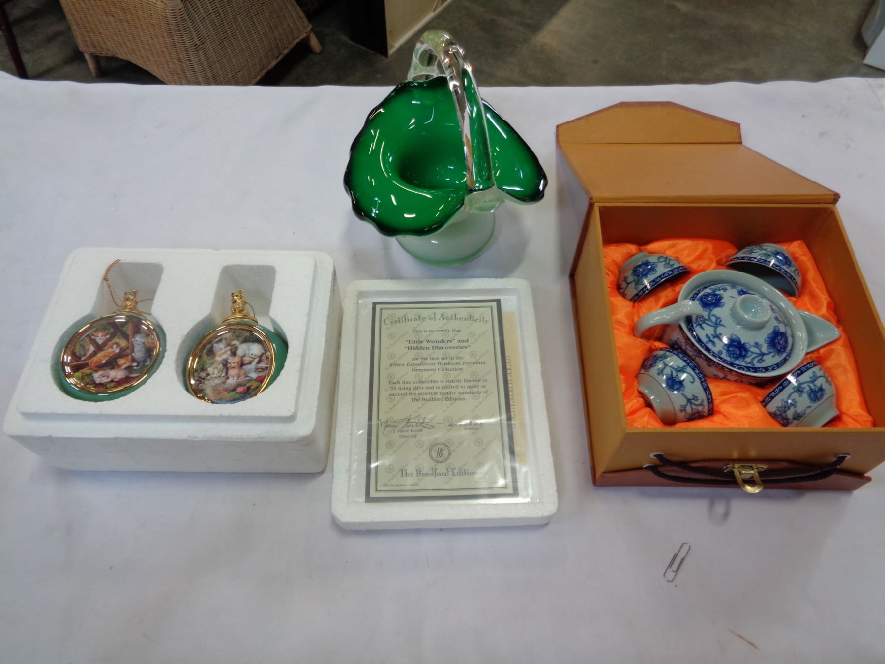 EASTERN TEA SET, ART GLASS BASKET AND CAT ORNAMENTS