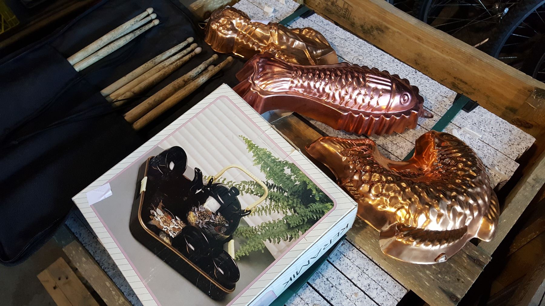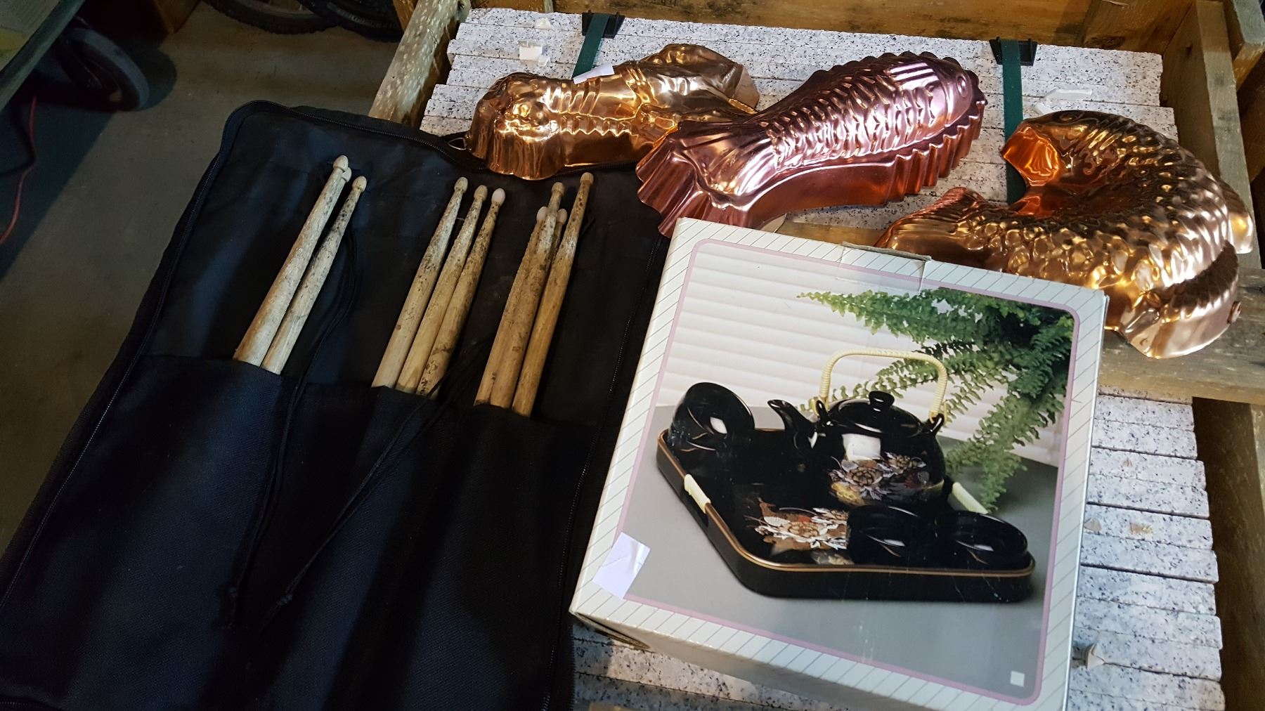 EASTERN TEA SET, COPPER MOULDS, LEASHES, AND DRUMSTICKS
