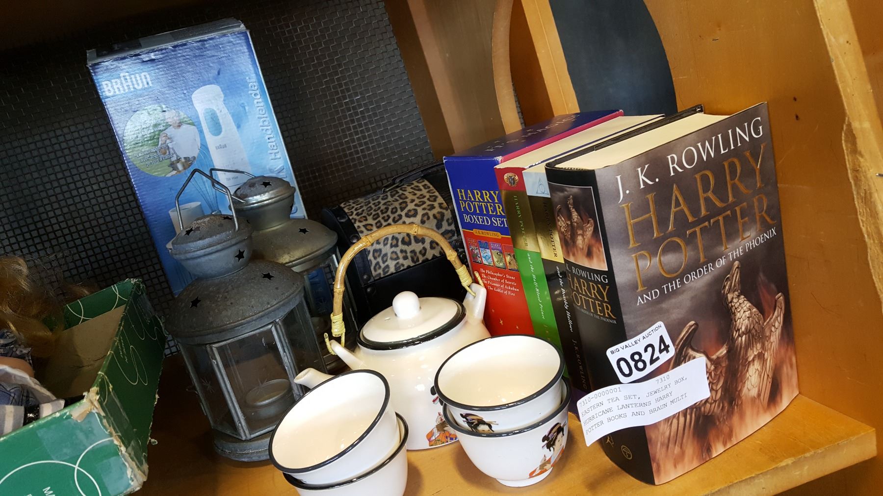 EASTERN TEA SET, JEWELRY BOX, HURRICANE LANTERNS HARRY POTTER BOOKS AND BRAUN MULTI HAND BLENDER