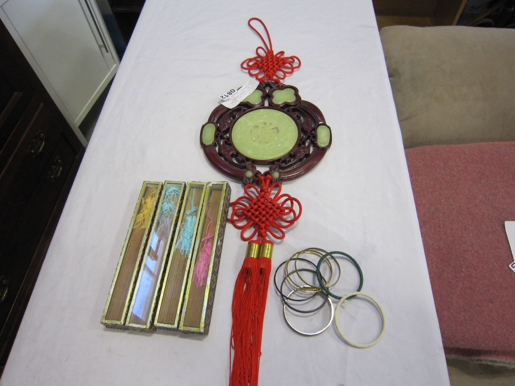 EASTERN WALL ART JADE LOOK, 4 FANS, AND CINNABAR ENAMEL AND BRASS BANGLES