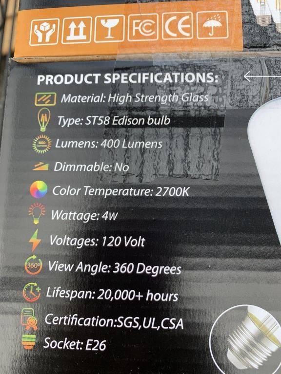 EIGHT BOXES OF BERELLI ST58 4W 2700K E26 STANDARD SOCKET LIGHT BULBS SIX PER BOX RETAIL $200