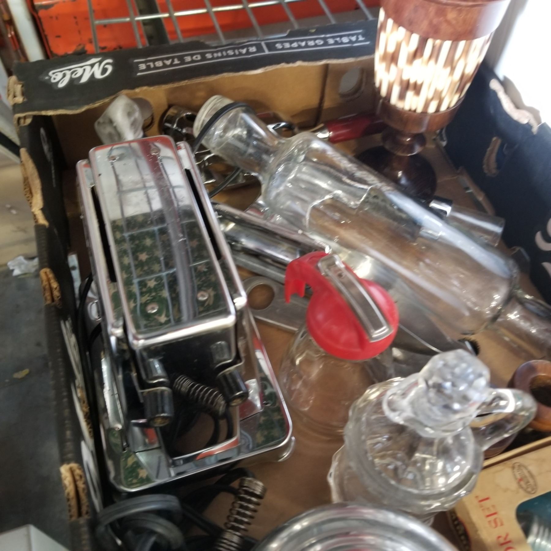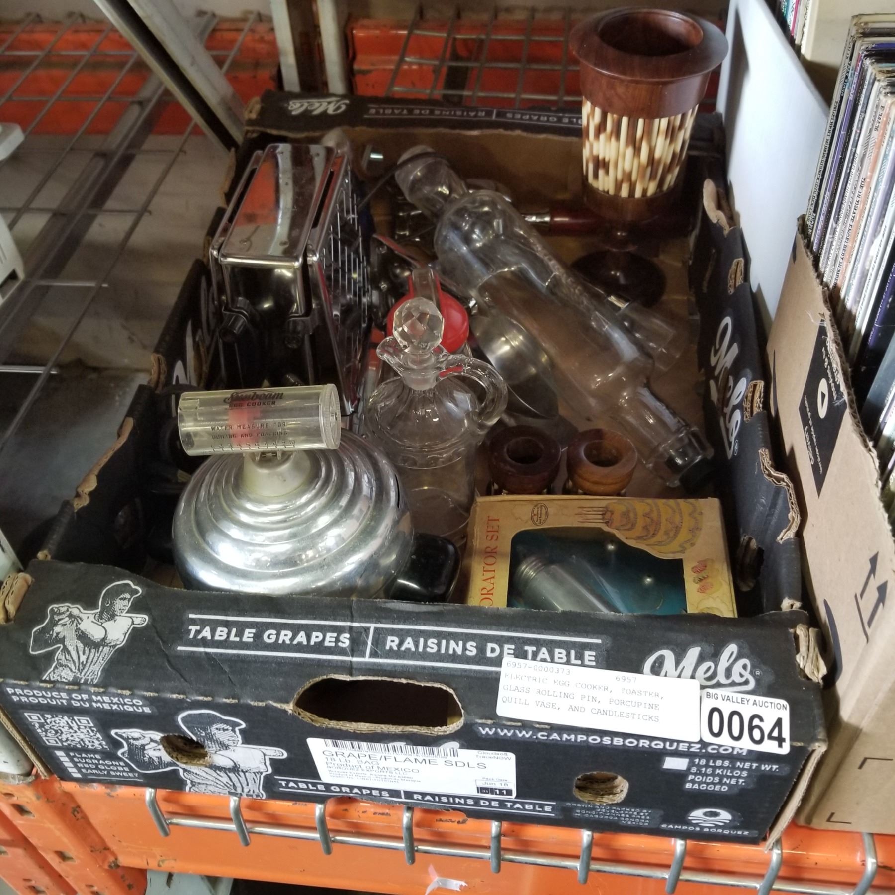 ELECTRIC EGG COOKER, TOASTER, GLASS ROLLING PIN, PORCUPINE QUILL VASE, AND CANDLESTICKS