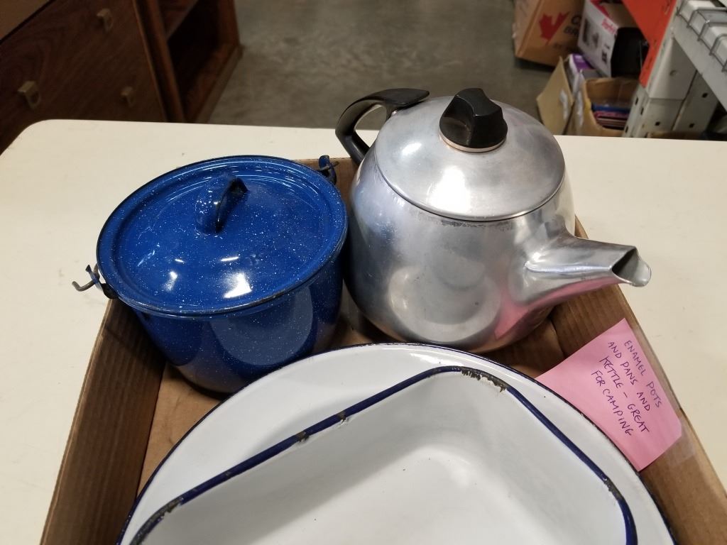 ENAMEL POTS AND PANS AND KETTLE