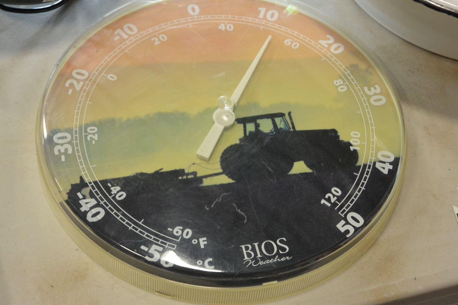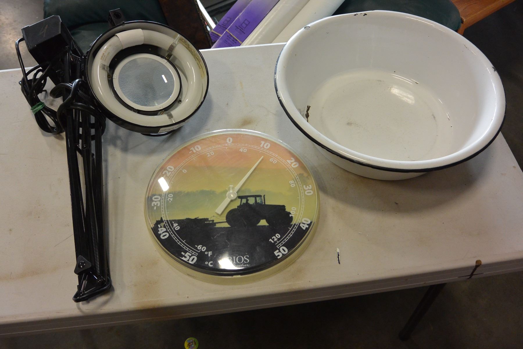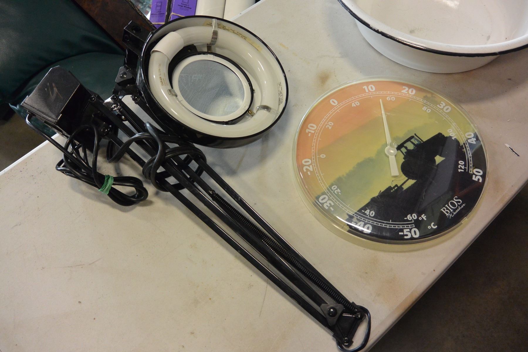 ENAMELED WASH BASIN MAGNIFYING DESK LAMP AND THERMOMETER