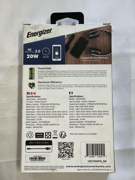 ENERGIZER 27,000MAH DUAL USB/USB-C POWER BANK - RETAIL $89
