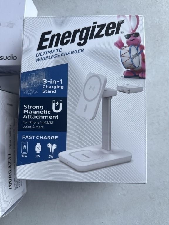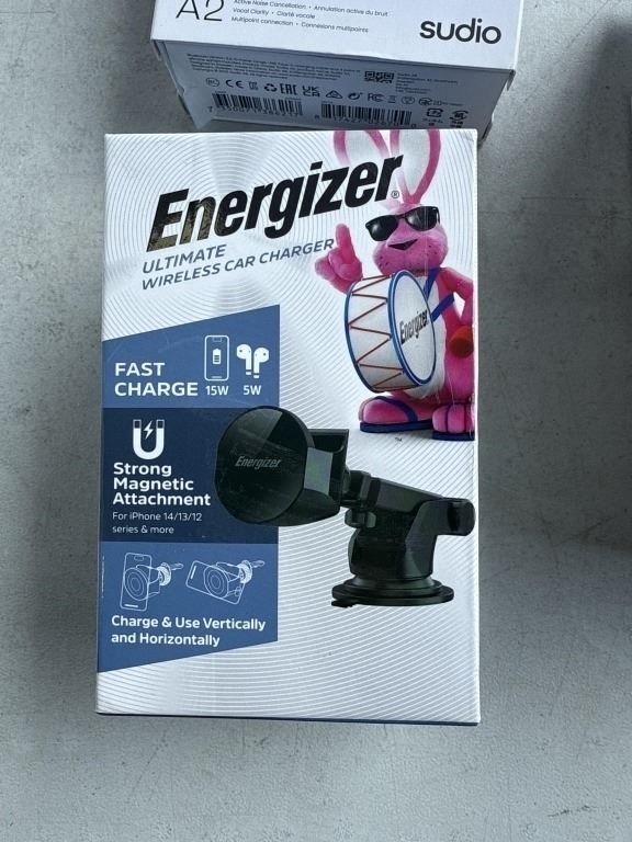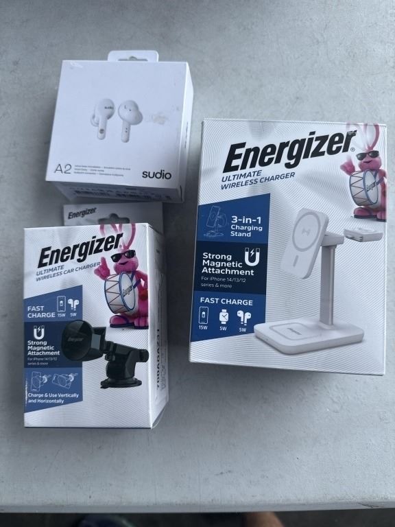 ENERGIZER ULTIMATE FAST CHARGE WIRELESS 3 IN 1 CHARGING STAND, ENERGIZER ULTIMATE WIRELESS CAR CHARGER, AND SUDIO A2 BLUETOOTH WIRELESS EARBUDS