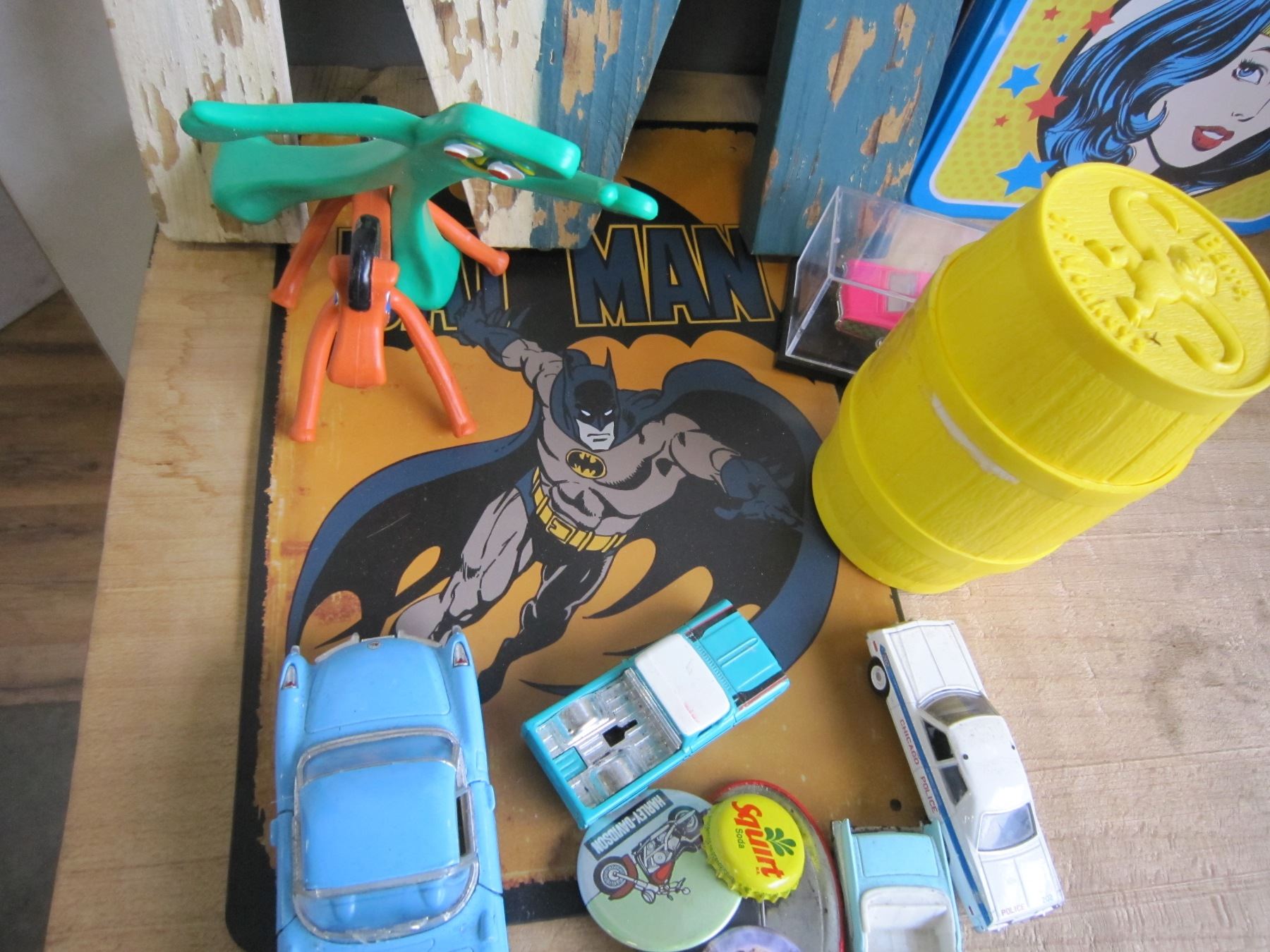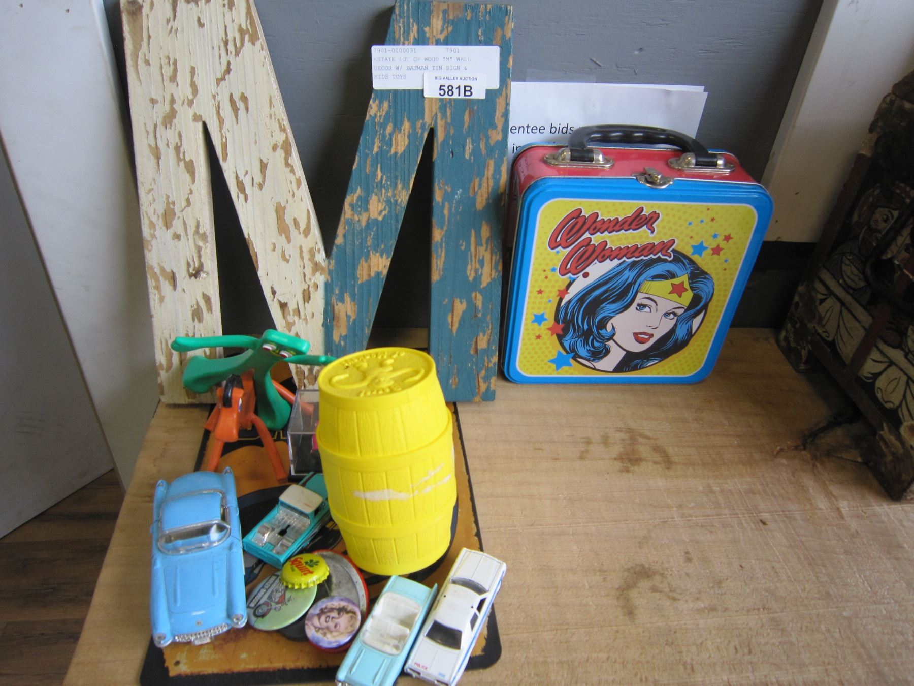 ESTATE LOT OF WOOD "M" WALL DECOR W/ BATMAN TIN SIGN & KIDS TOYS