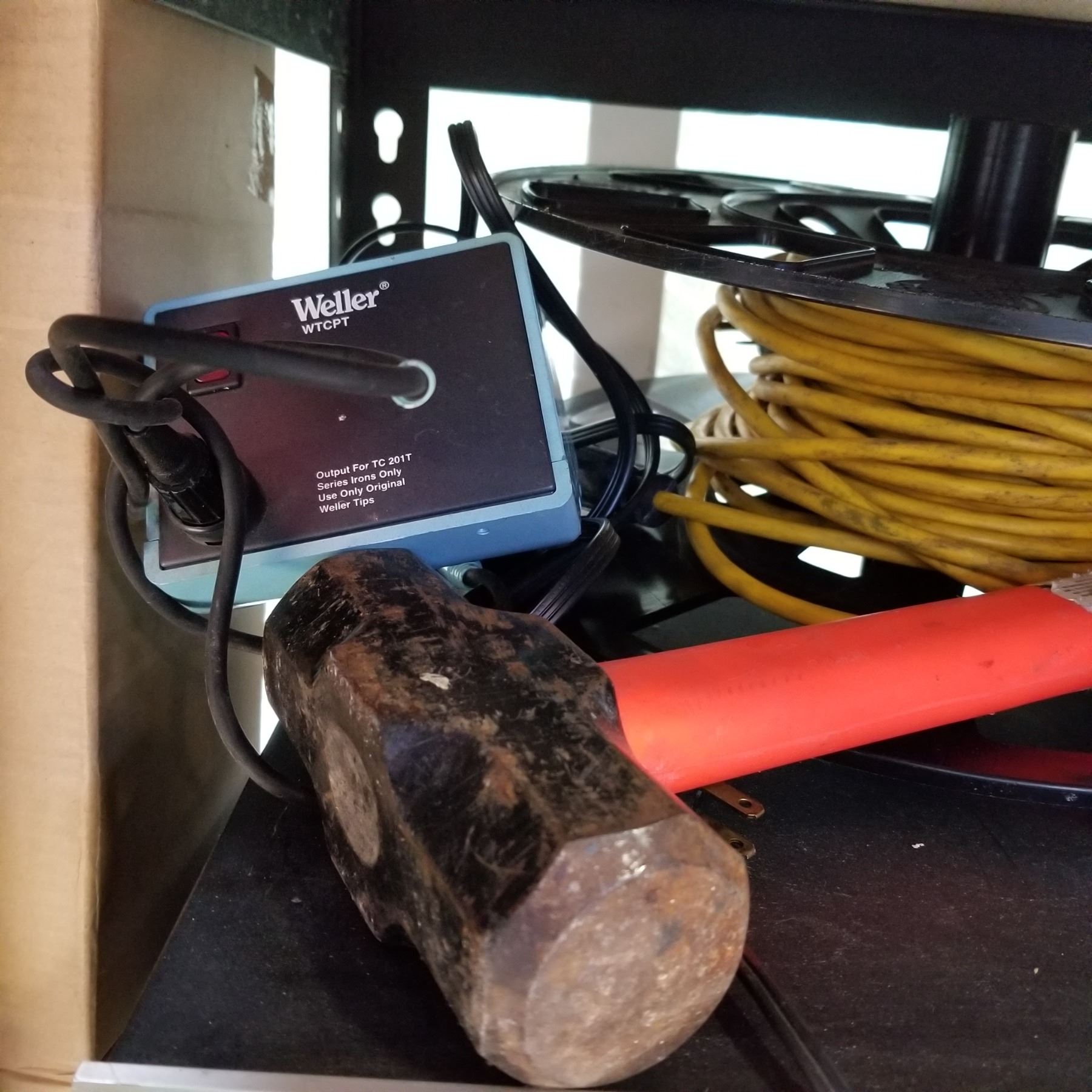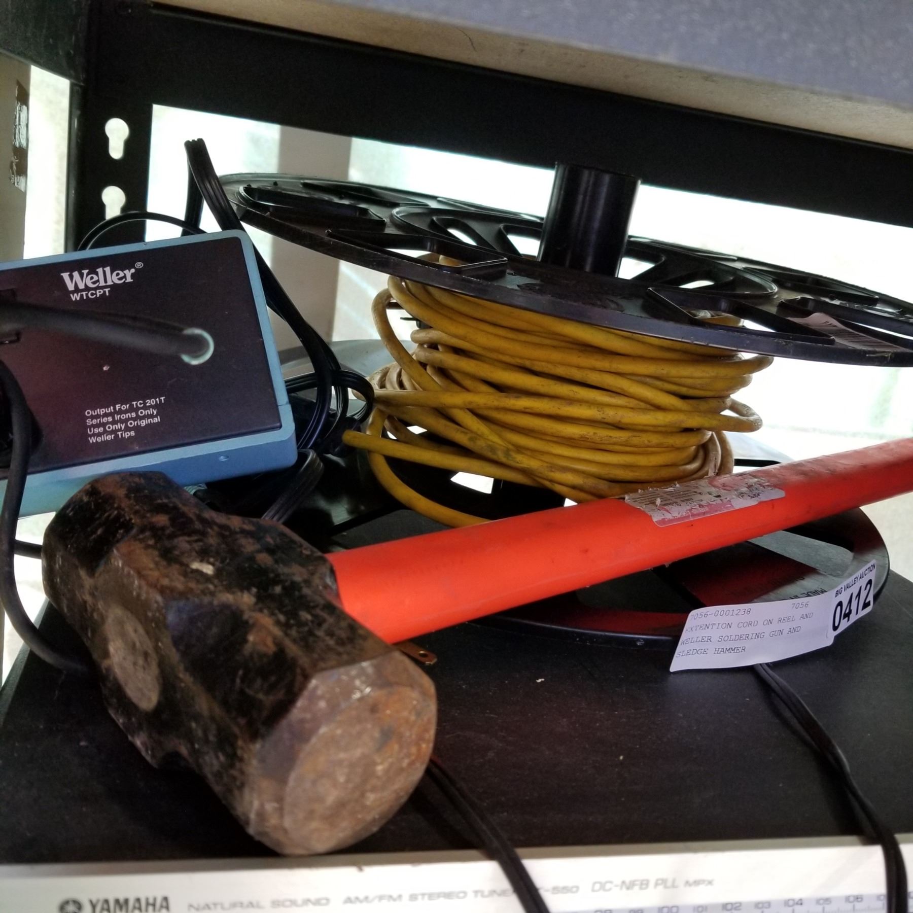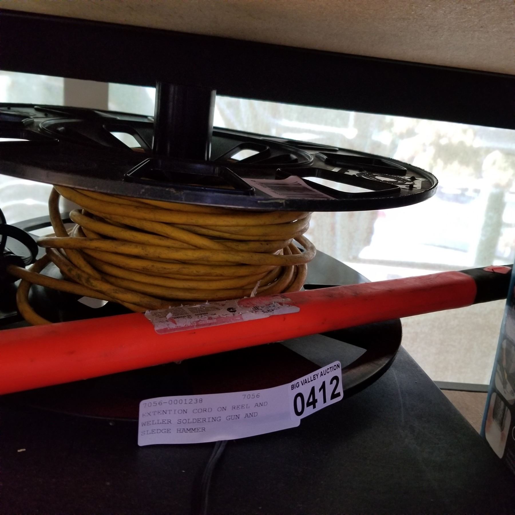 EXTENTION CORD ON REEL AND WELLER SOLDERING GUN AND SLEDGE HAMMER
