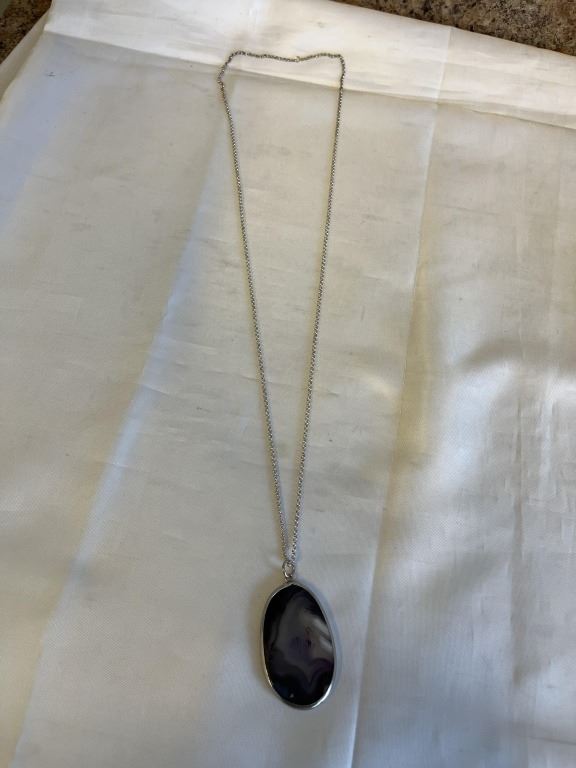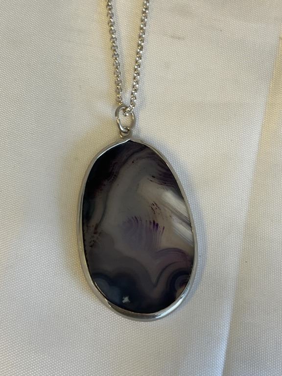 EXTREME LENGTH STERLING SILVER CHAIN W/ LACE AGATE STONE PENDANT