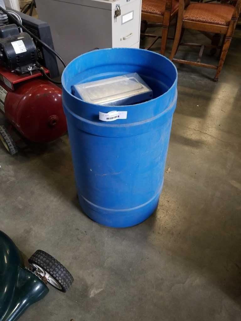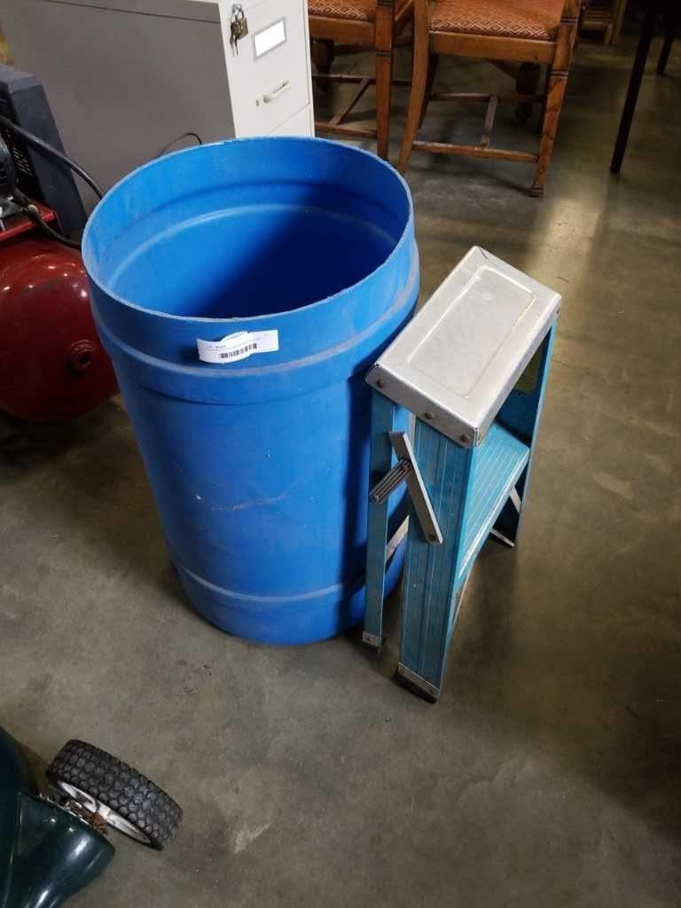 FEATHERLITE ALUMINUM SINGLE STEP LADDER, REMMINGTON POWER HAMMER AND BLUE BARREL