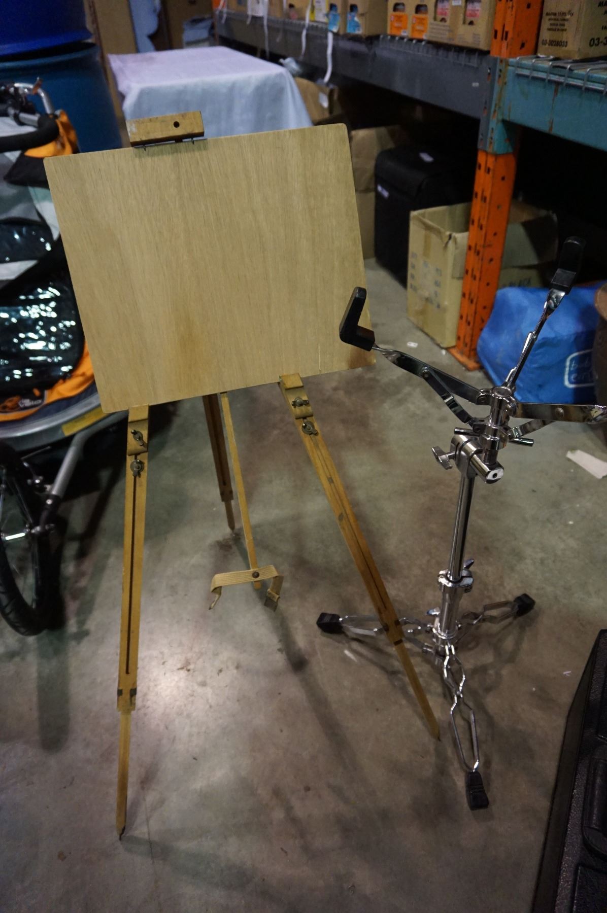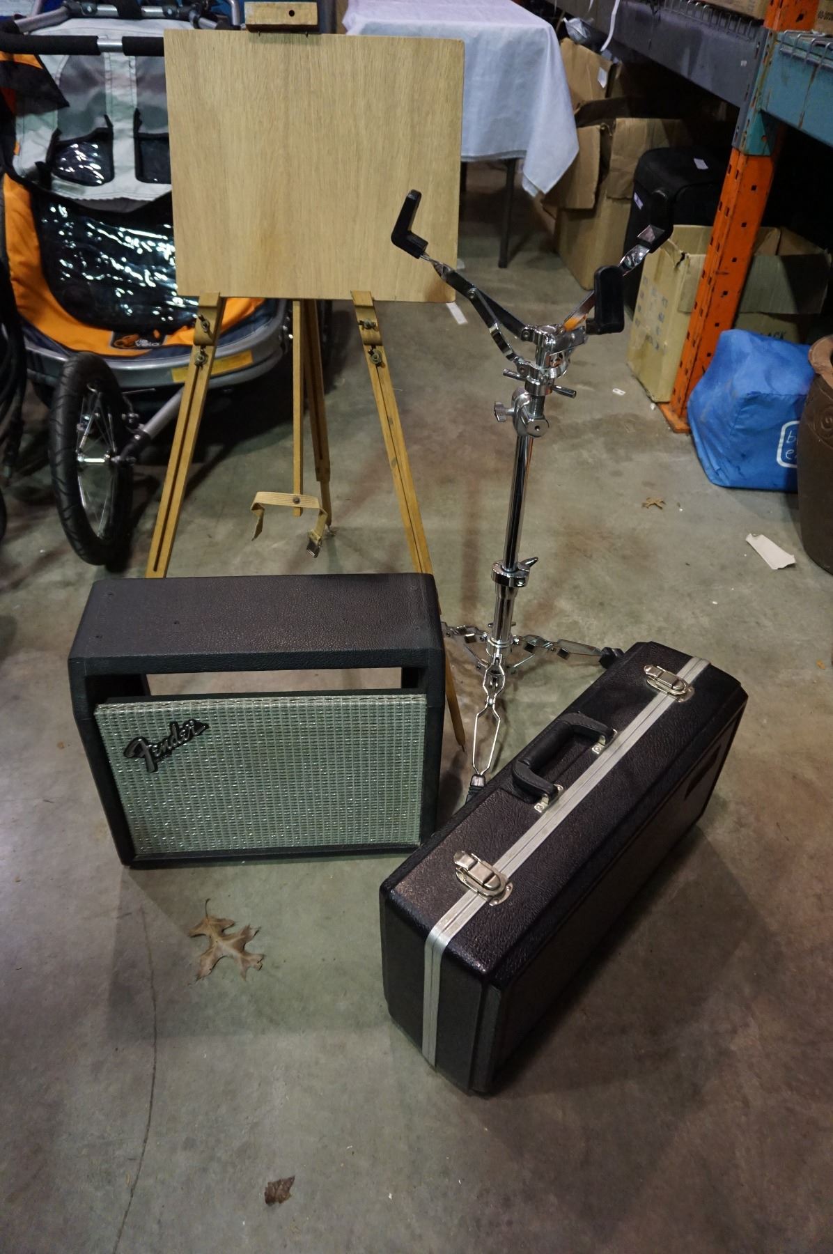 FENDER SPEAKER, SNARE DRUM STAND, INSTRUMENT HARD CASE, AND EASEL
