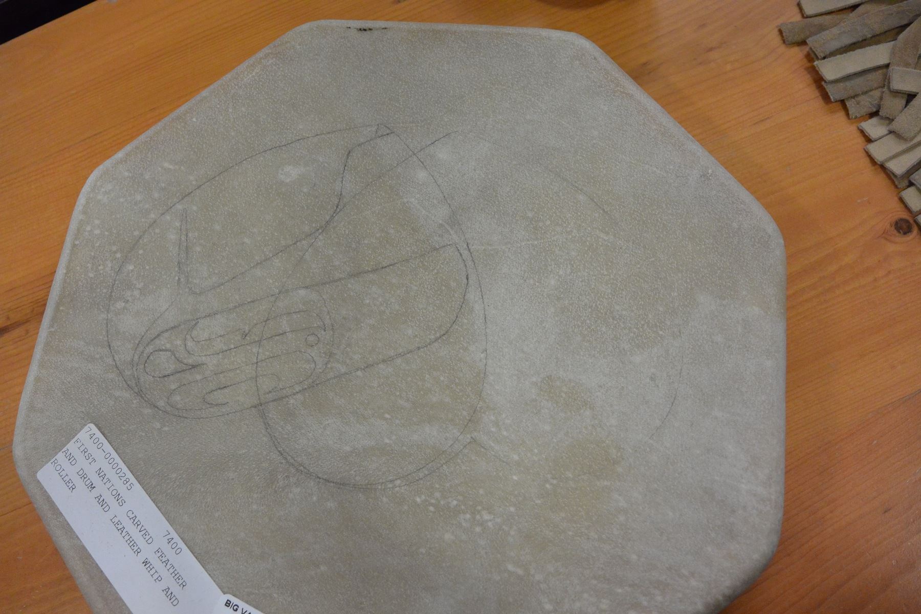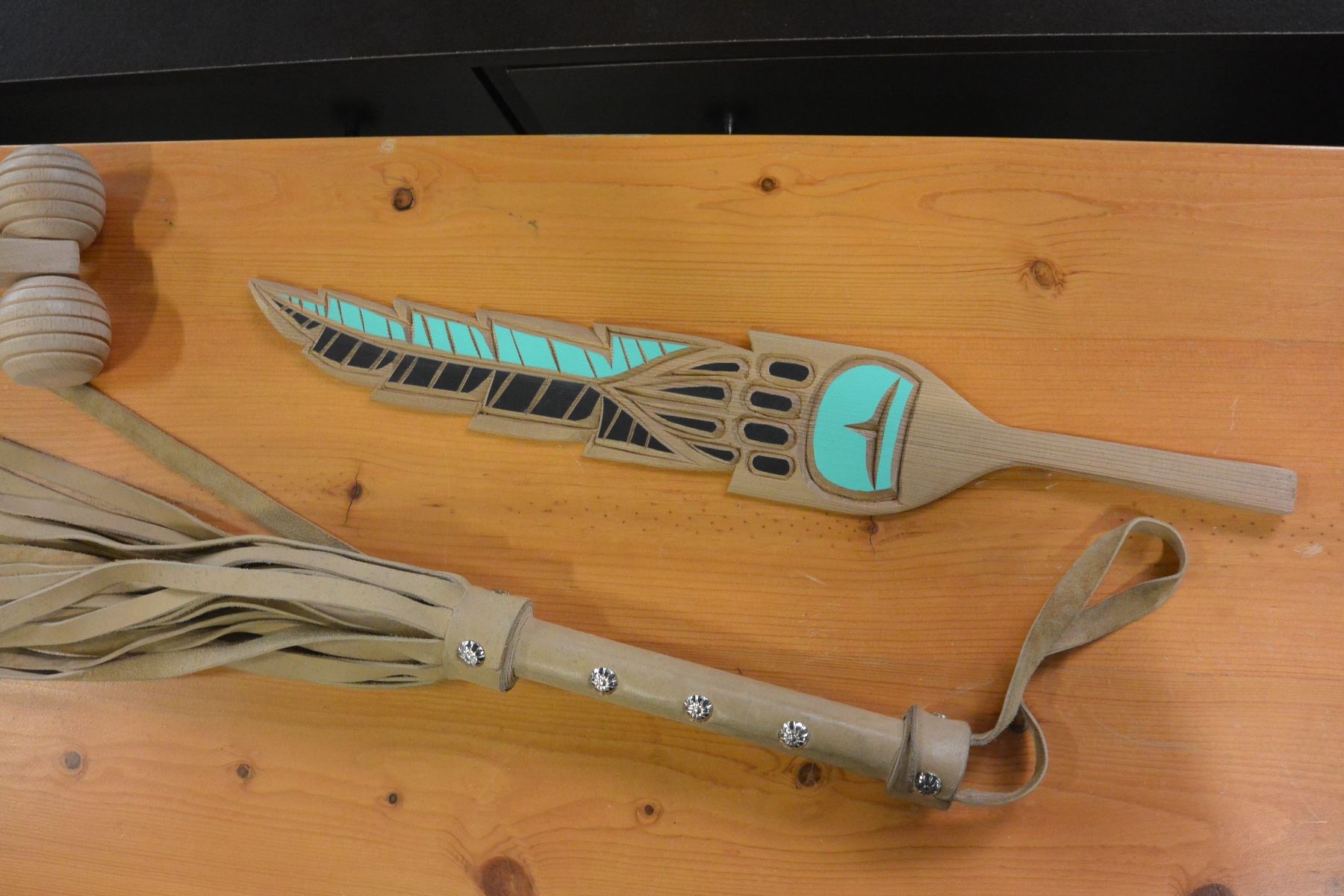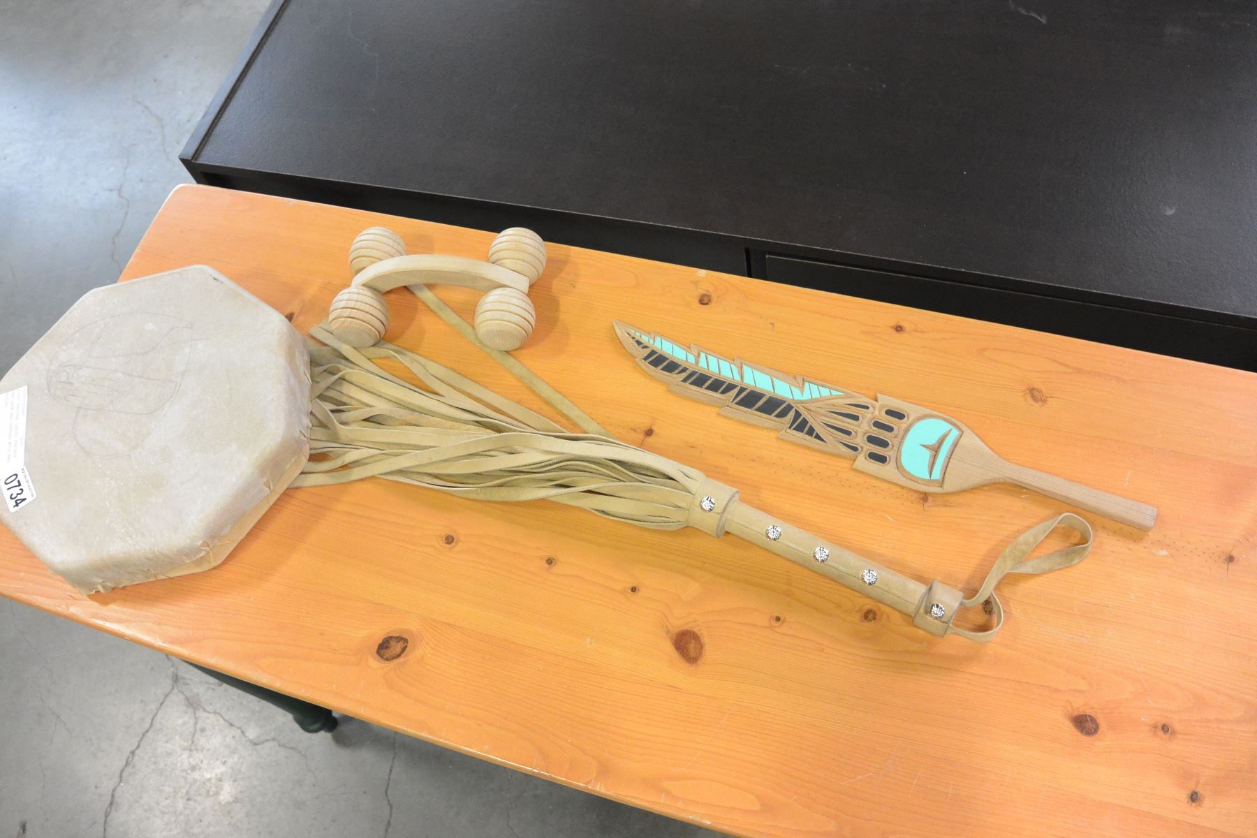 FIRST NATIONS CARVED FEATHER AND DRUM AND LEATHER WHIP AND ROLLER