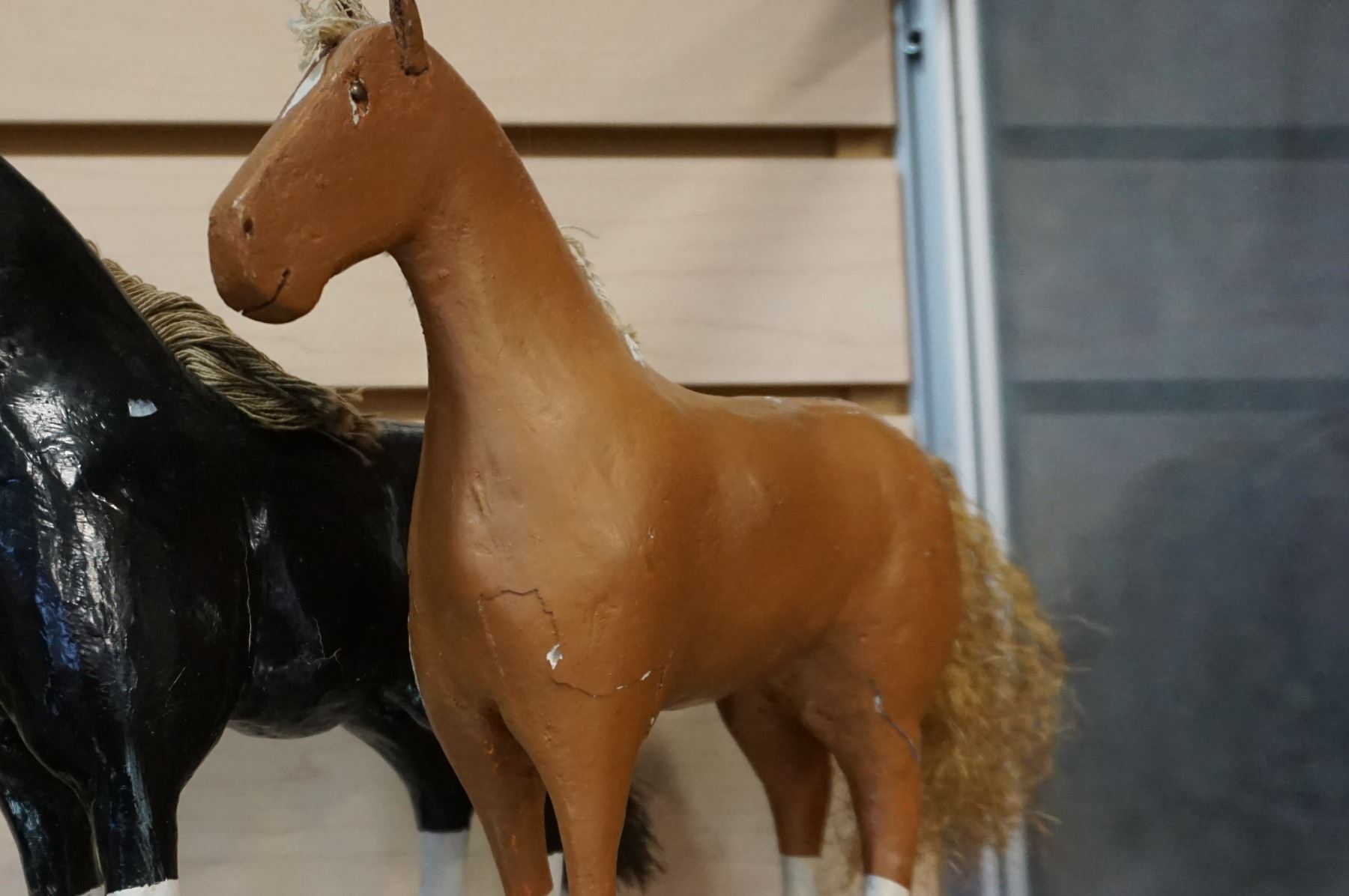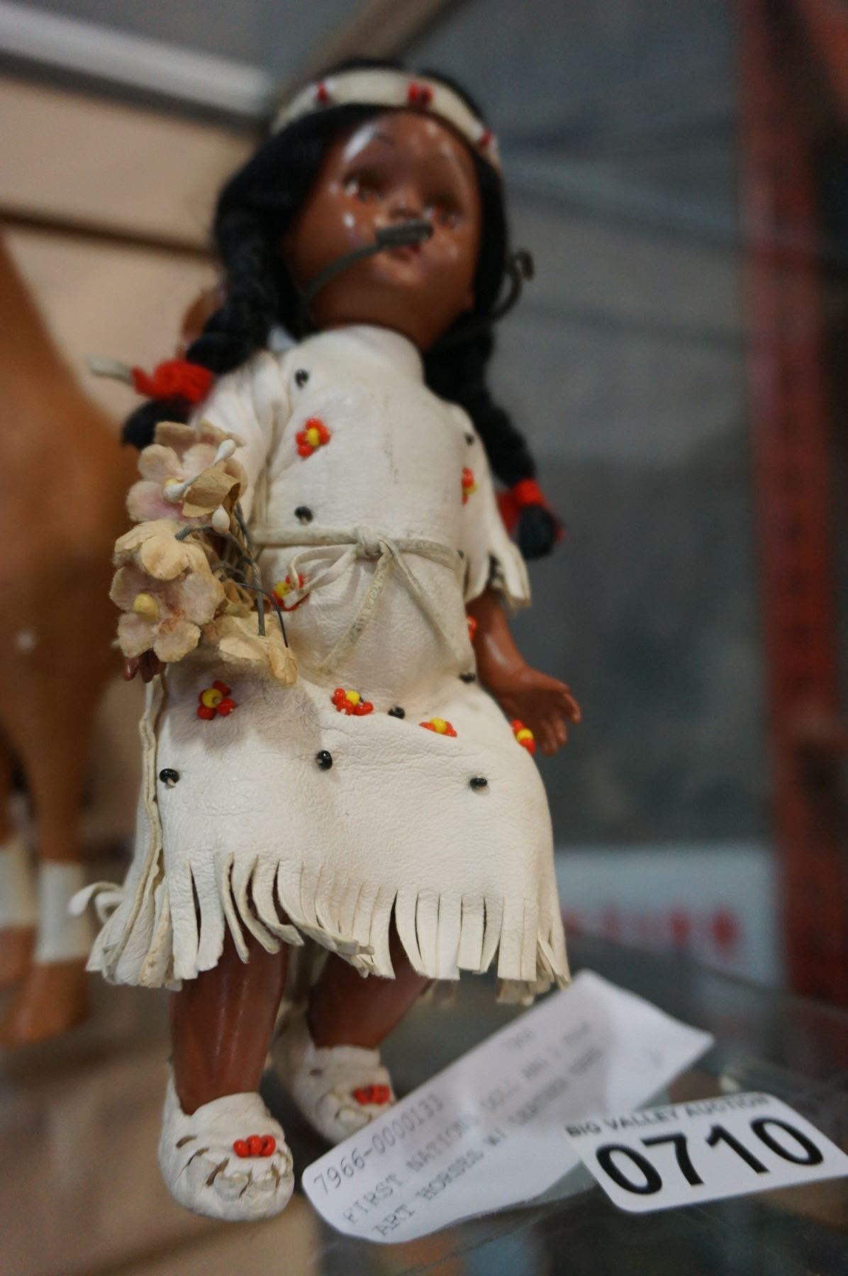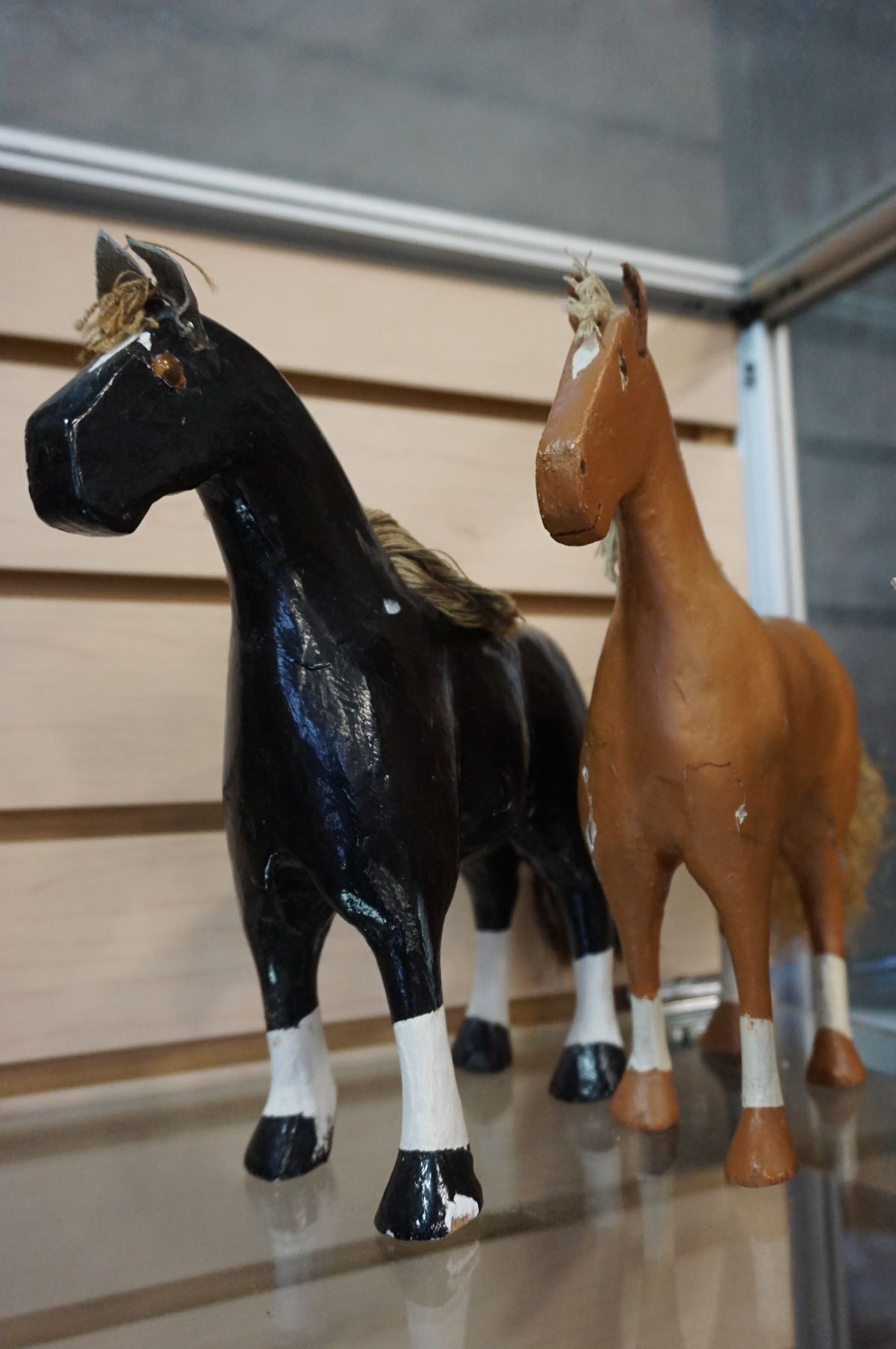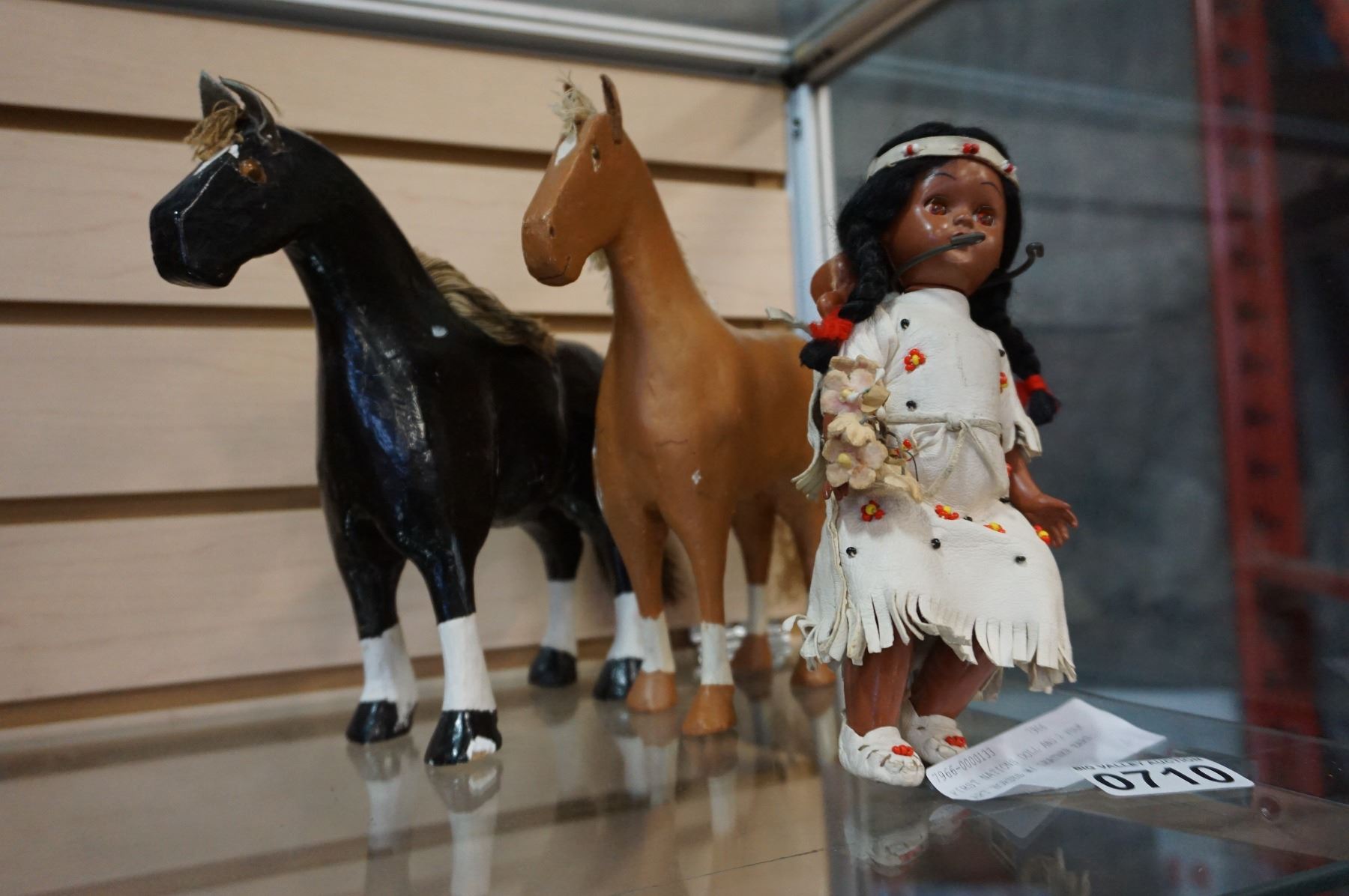 FIRST NATIONS DOLL AND 2 FOLK ART HORSES W/ LEATHER EARS