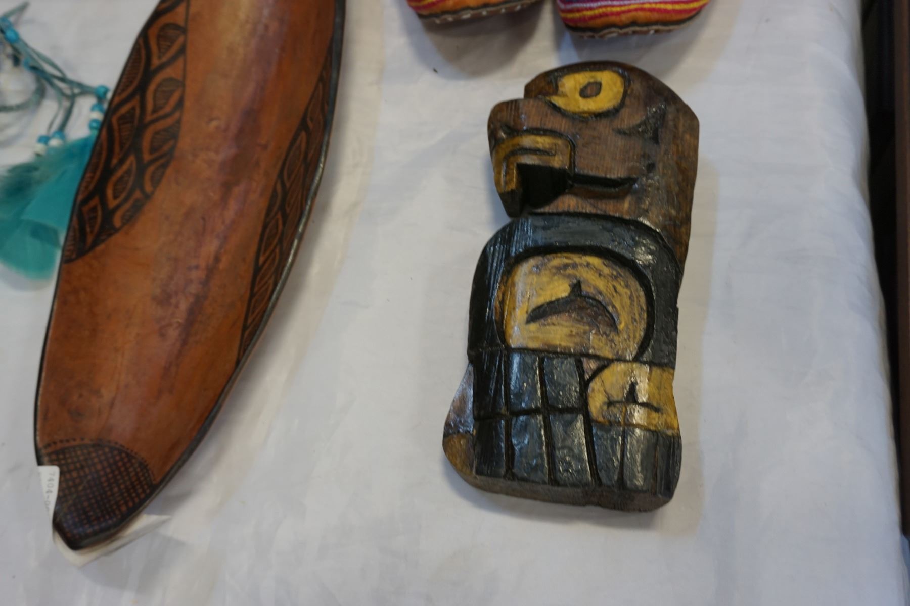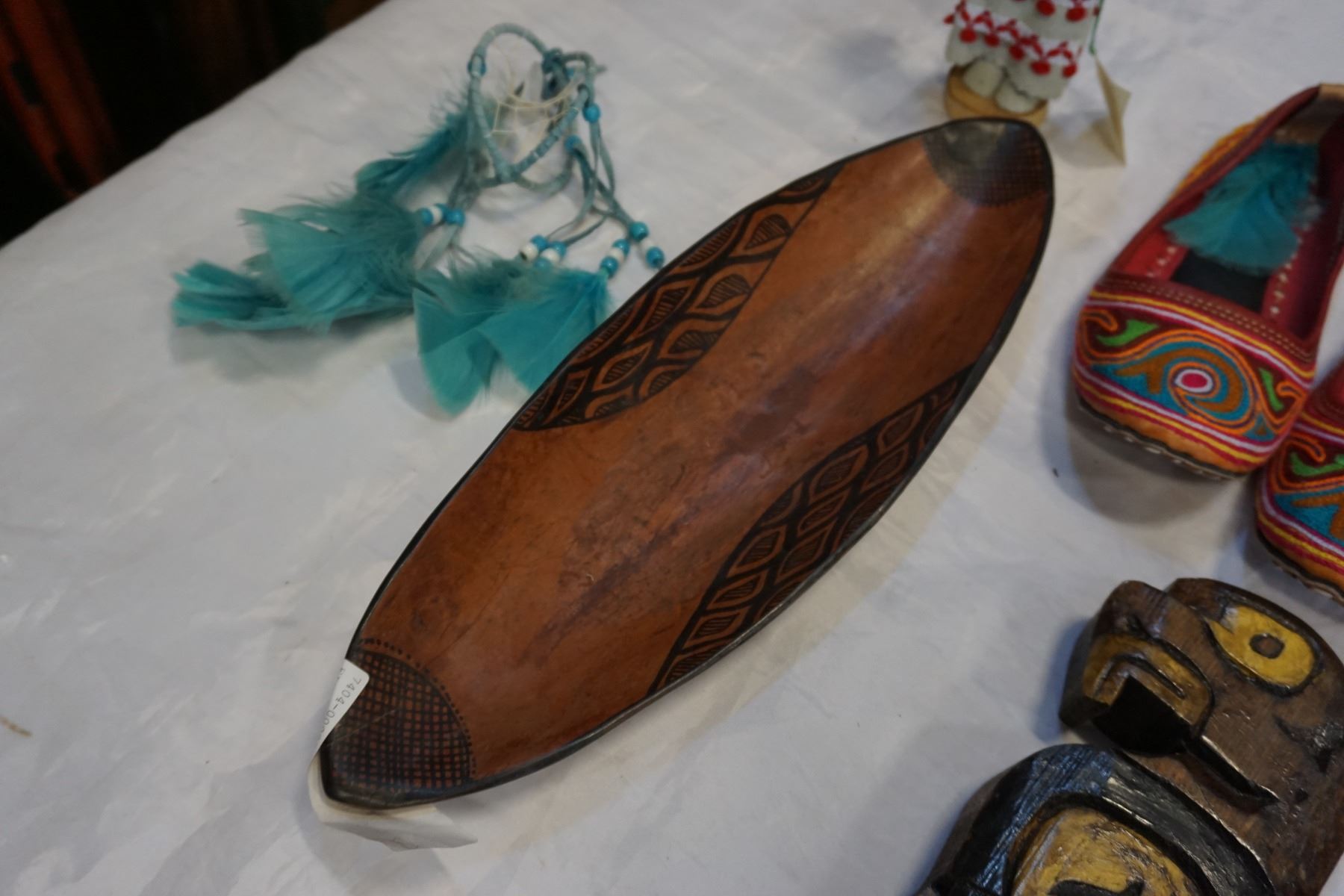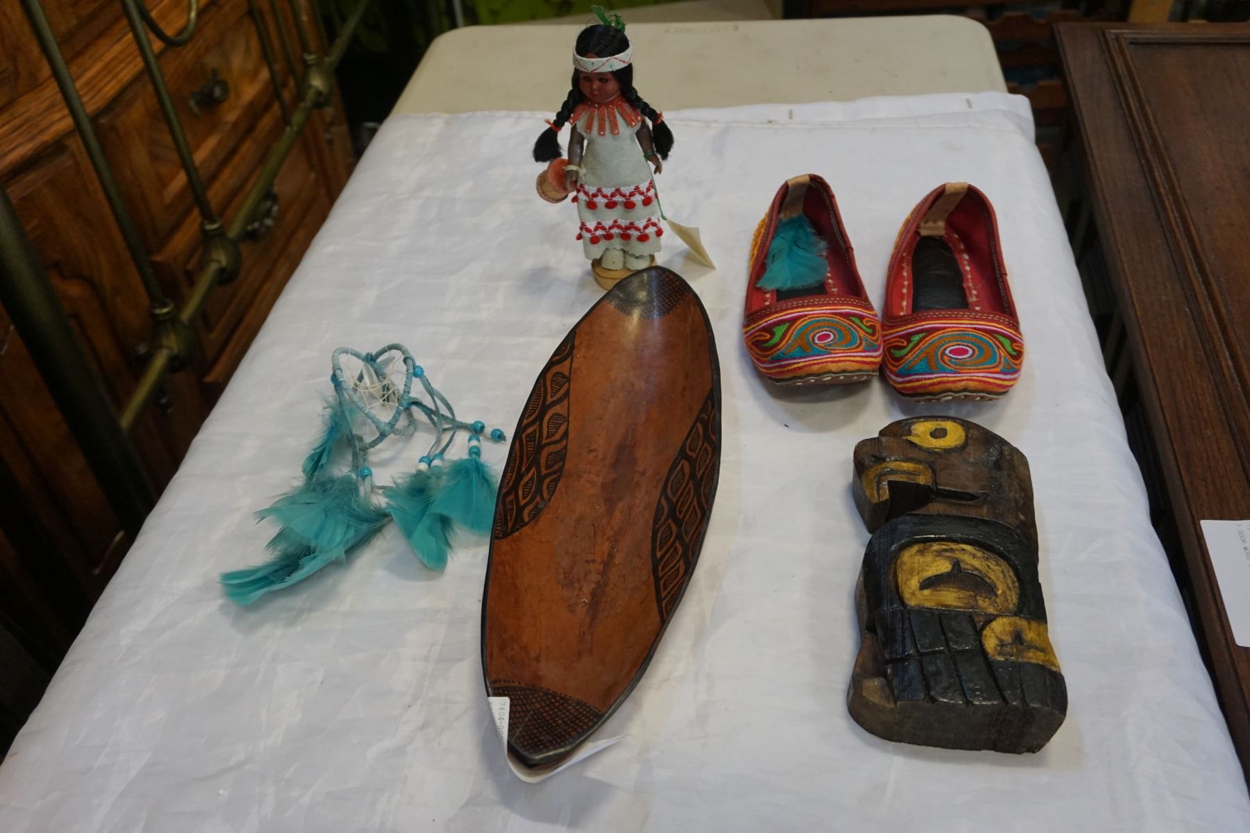 FIRST NATIONS SLIPPERS, SMALL CARVED TOTEM, AND BOWL W/ DREAMCATCHER