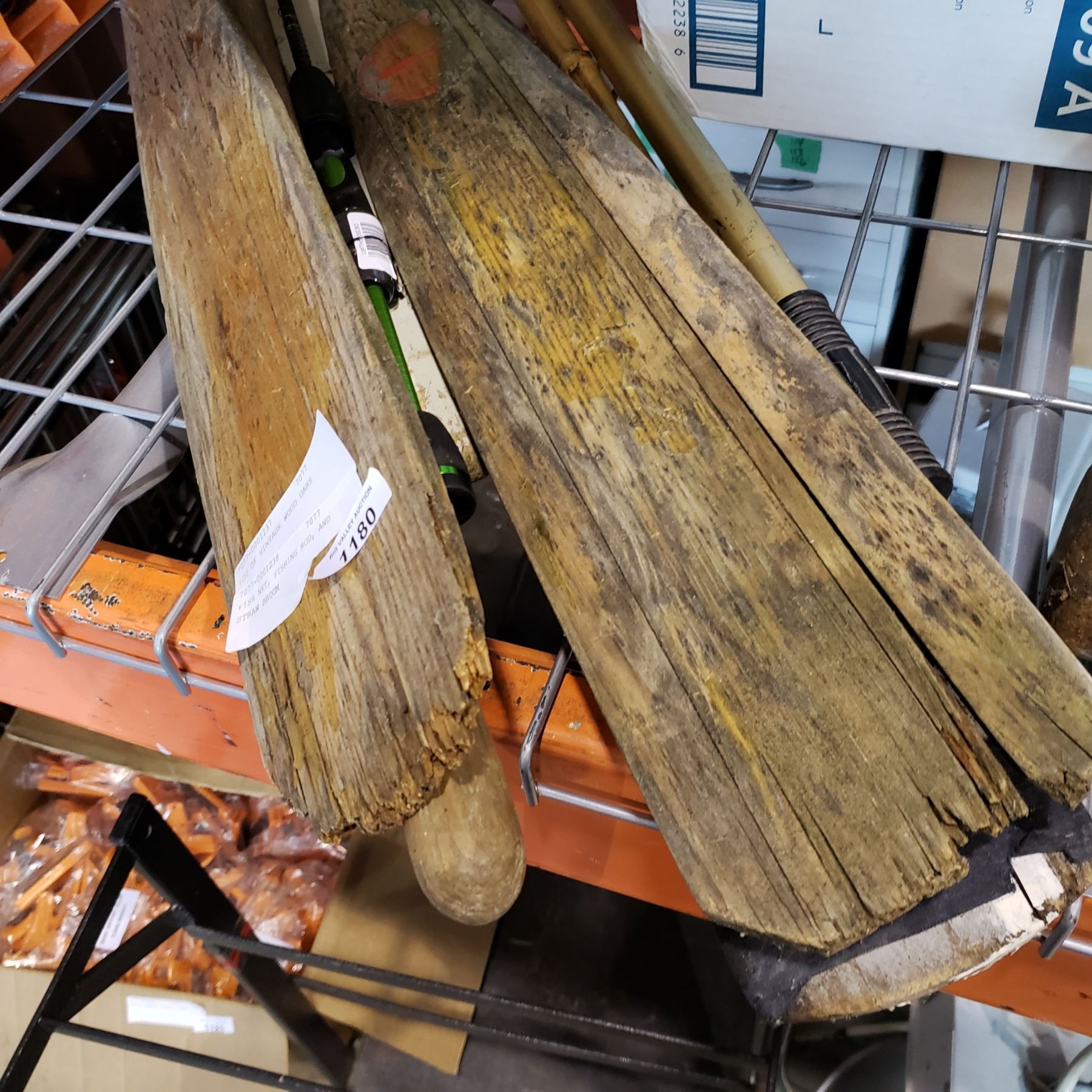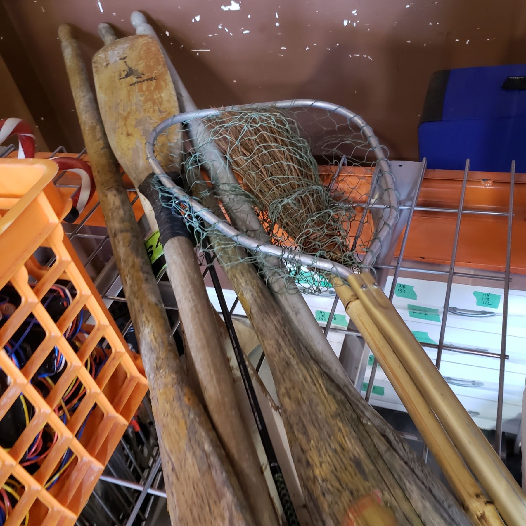 FISH NET, FISHING ROD, AND STRAW BROOM AND LOT OF VINTAGE WOOD OARS