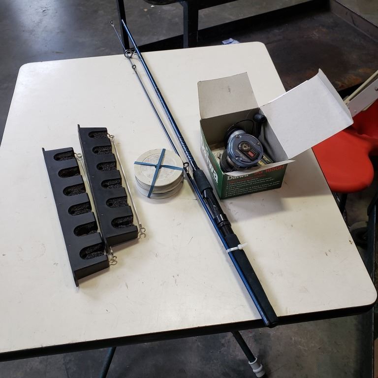 FISHING POLE WITH POLE HOLDER, MILLIONAIRE AND DAIWA REELS
