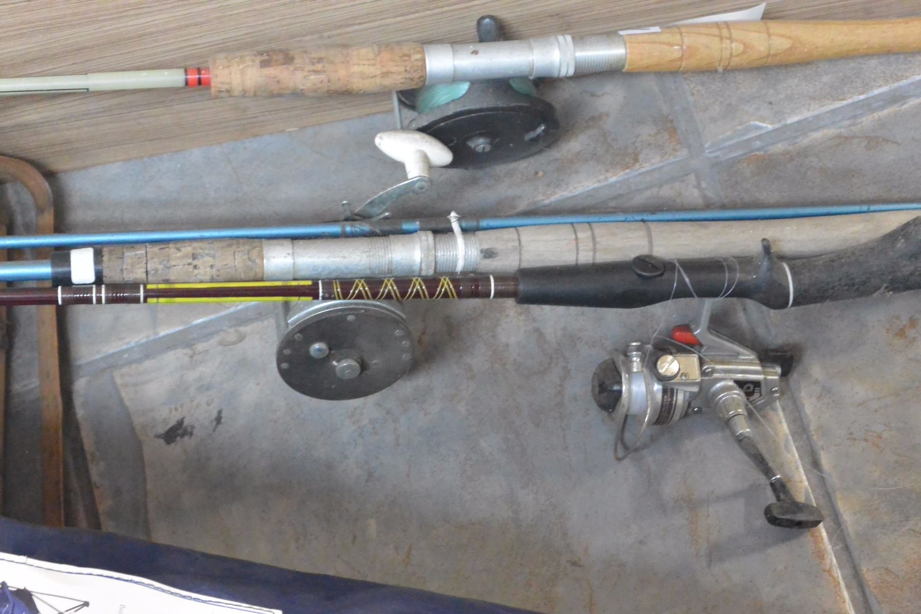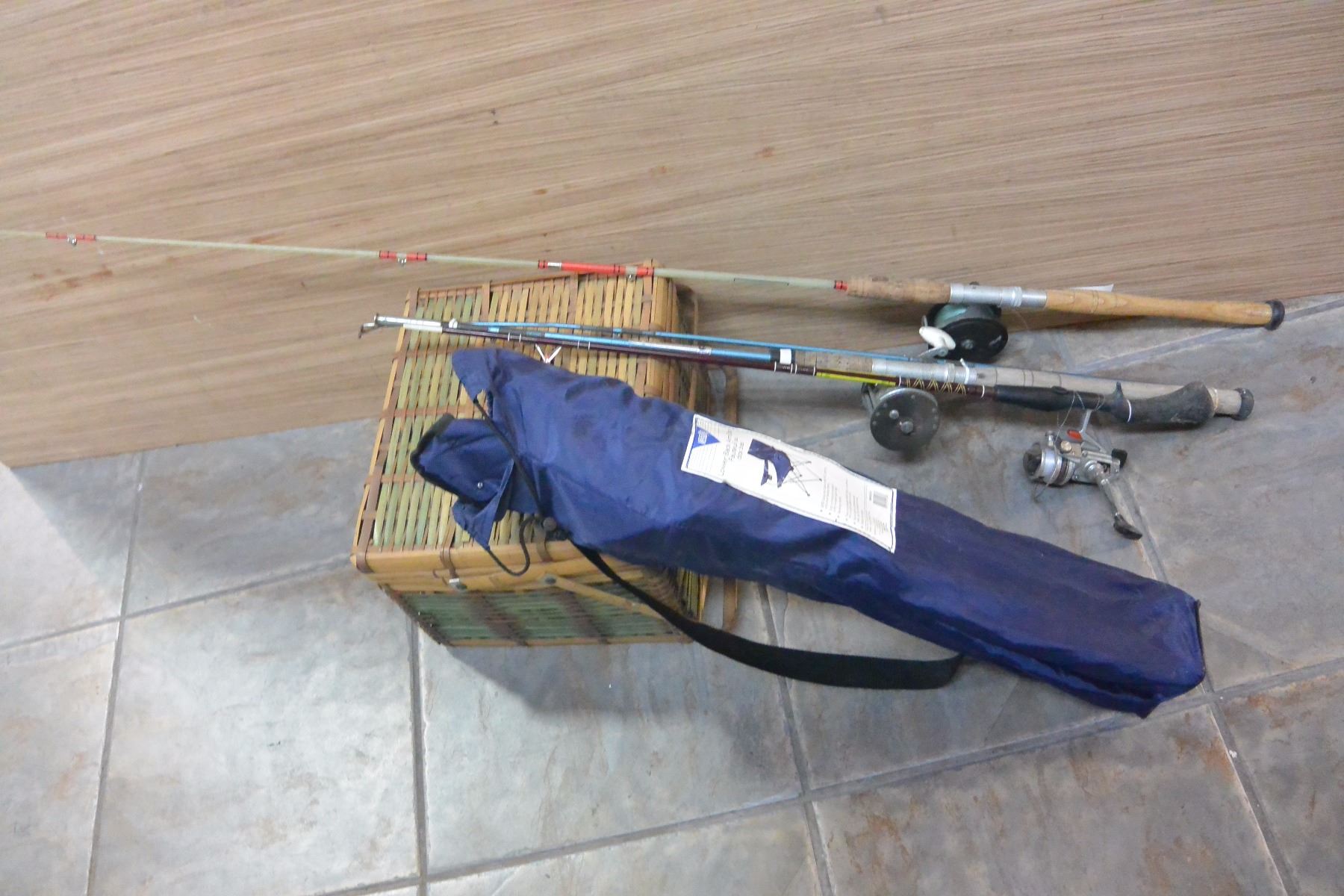 FISHING RODS AND CAMP CHAIR AAND UMBRELLA AND PICNIC BASKET